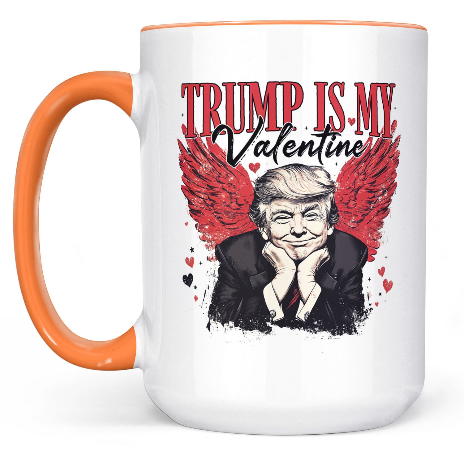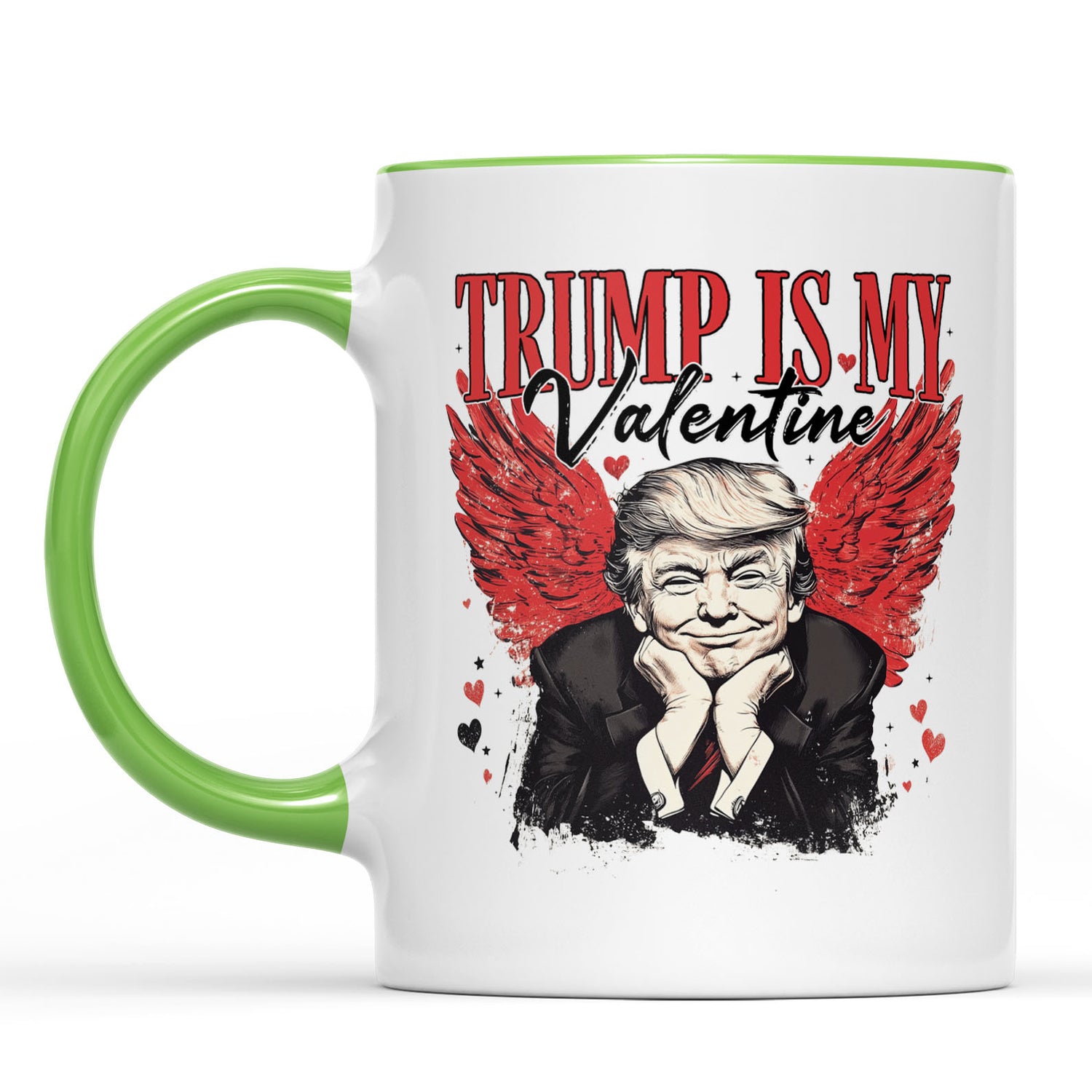 This design showcases a whimsical and bold illustration of Donald Trump, resting his chin on his hands with a playful expression. Behind him, a striking pair of distressed red angel wings spread outward, surrounded by scattered hearts and sparkles, enhancing the romantic and edgy aesthetic. The phrase "TRUMP IS MY Valentine" is prominently displayed above the image, combining bold serif and elegant script fonts for contrast and emphasis. Perfect for Valentine's Day, this design humorously blends admiration and festive charm, making it a standout gift for Trump supporters or anyone with a sense of humor.
