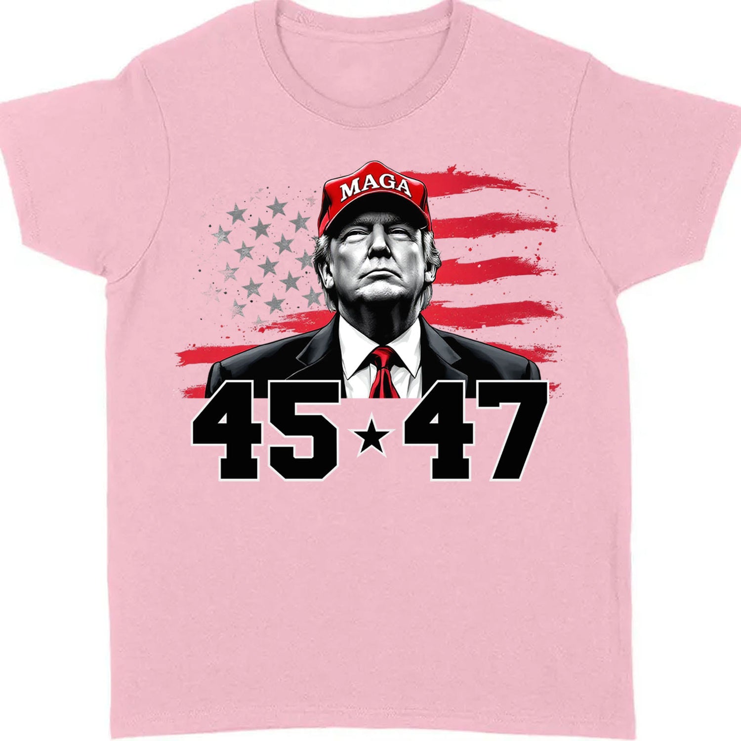This bold and patriotic t-shirt features a striking design of a confident figure wearing a red "MAGA" hat, set against a distressed American flag backdrop. The numbers "45 ★ 47" prominently displayed symbolize the potential return of leadership, resonating with supporters. Made with soft, high-quality fabric, this shirt is both comfortable and stylish, perfect for rallies, casual outings, or showing your support for the movement.