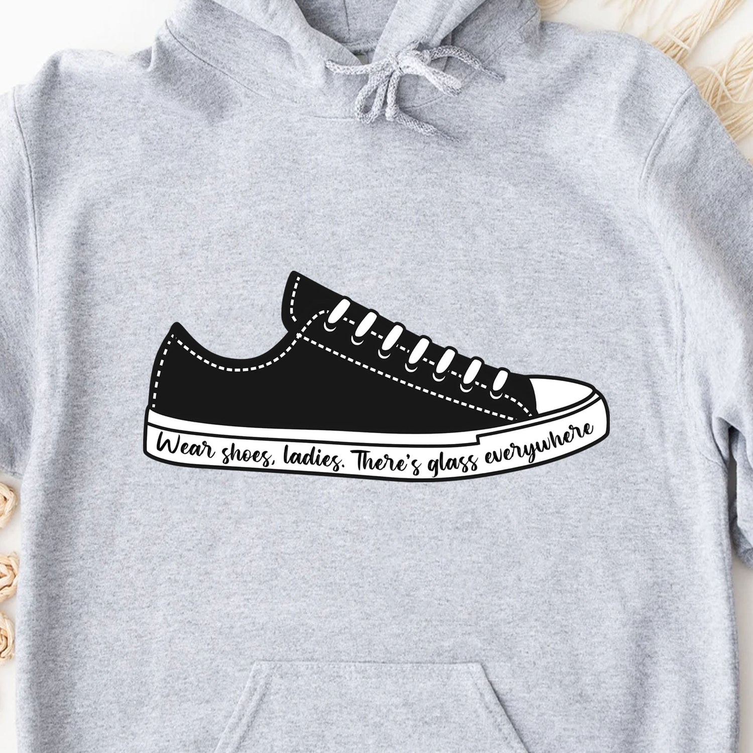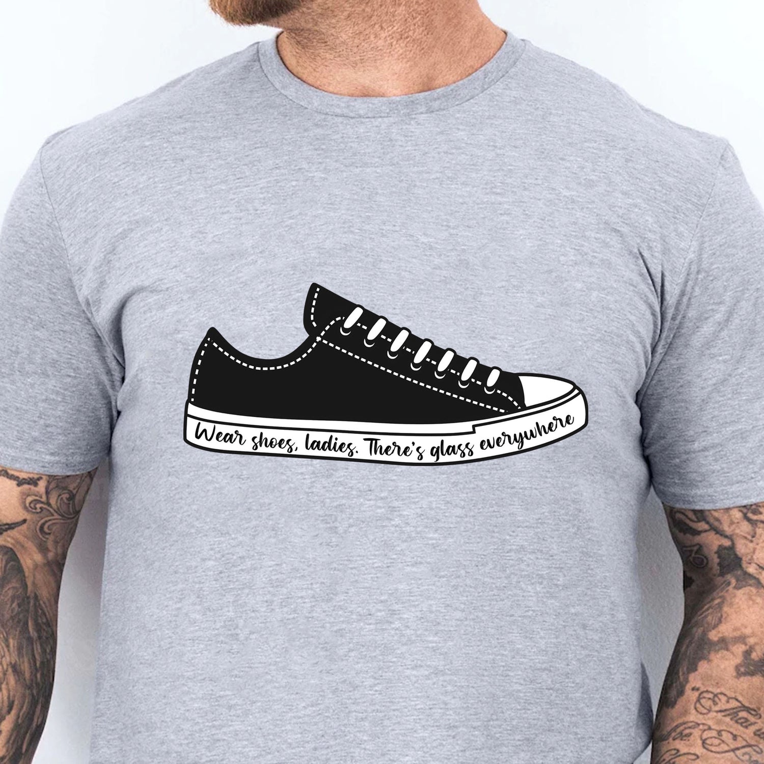 This t-shirt design features a stylish illustration of a sneaker with a powerful message. On the sneaker, the text "Wear shoes, ladies. There's glass everywhere" is elegantly written in a flowing script font. The design symbolizes breaking barriers and overcoming challenges, with the phrase hinting at the concept of "breaking the glass ceiling." The sneaker adds a casual, modern touch, making the shirt both fashionable and meaningful. It’s perfect for those who embrace empowerment and strength with a subtle yet impactful statement. The design uses black and white colors, highlighting support for Kamala Harris in a unique way.