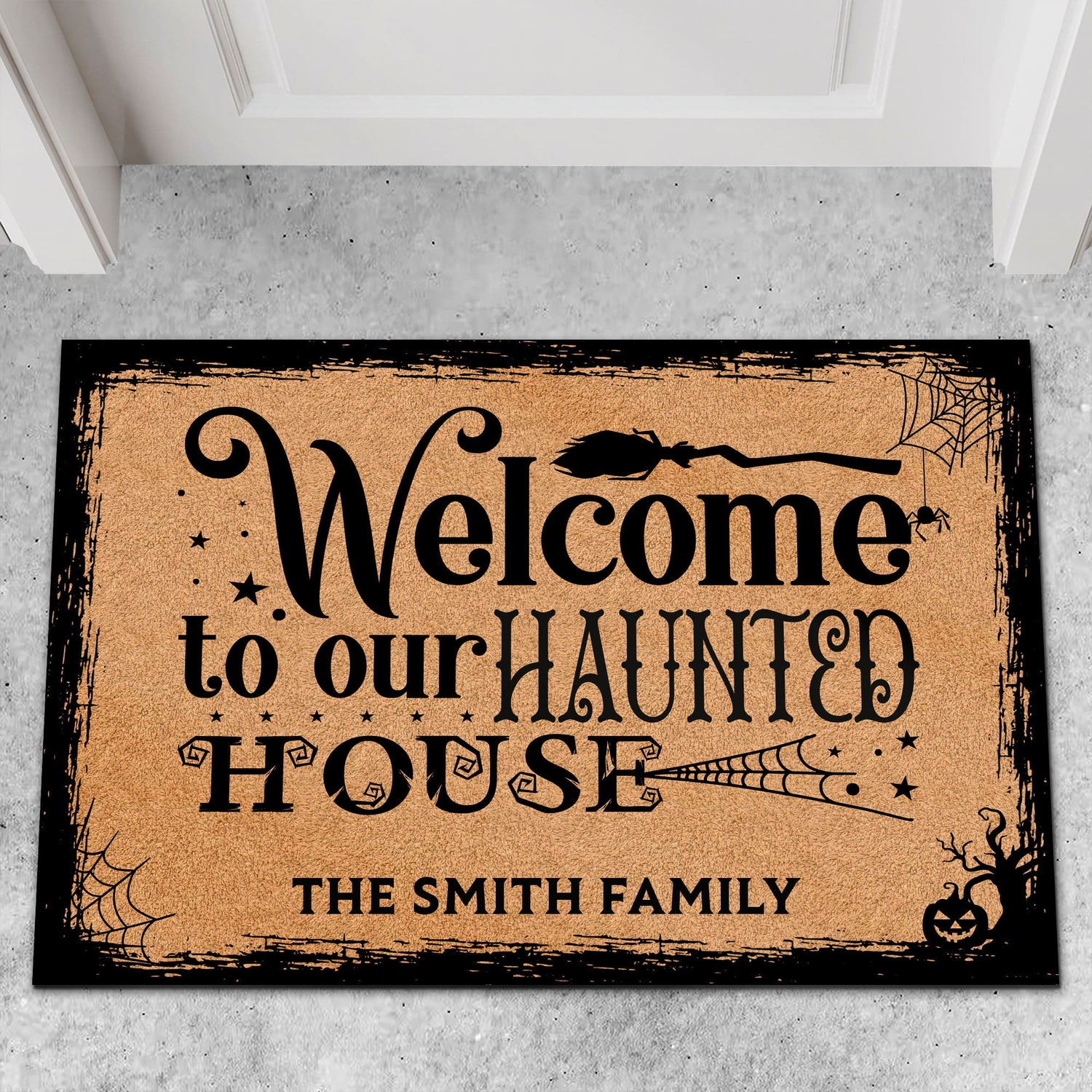 This doormat features a sleek black design that perfectly sets the tone for a spooky welcome. The phrase "Welcome to Our Haunted House" is elegantly written in a bold, eerie font. Intricately woven into the phrase are elements of a spider web, which subtly stretches across the letters, adding a touch of creepiness. Above the text, a witch's broom is artistically placed, appearing as if it's ready to sweep in more chills and thrills. The design creates an inviting yet ominous entrance, perfect for Halloween or year-round for fans of the macabre.