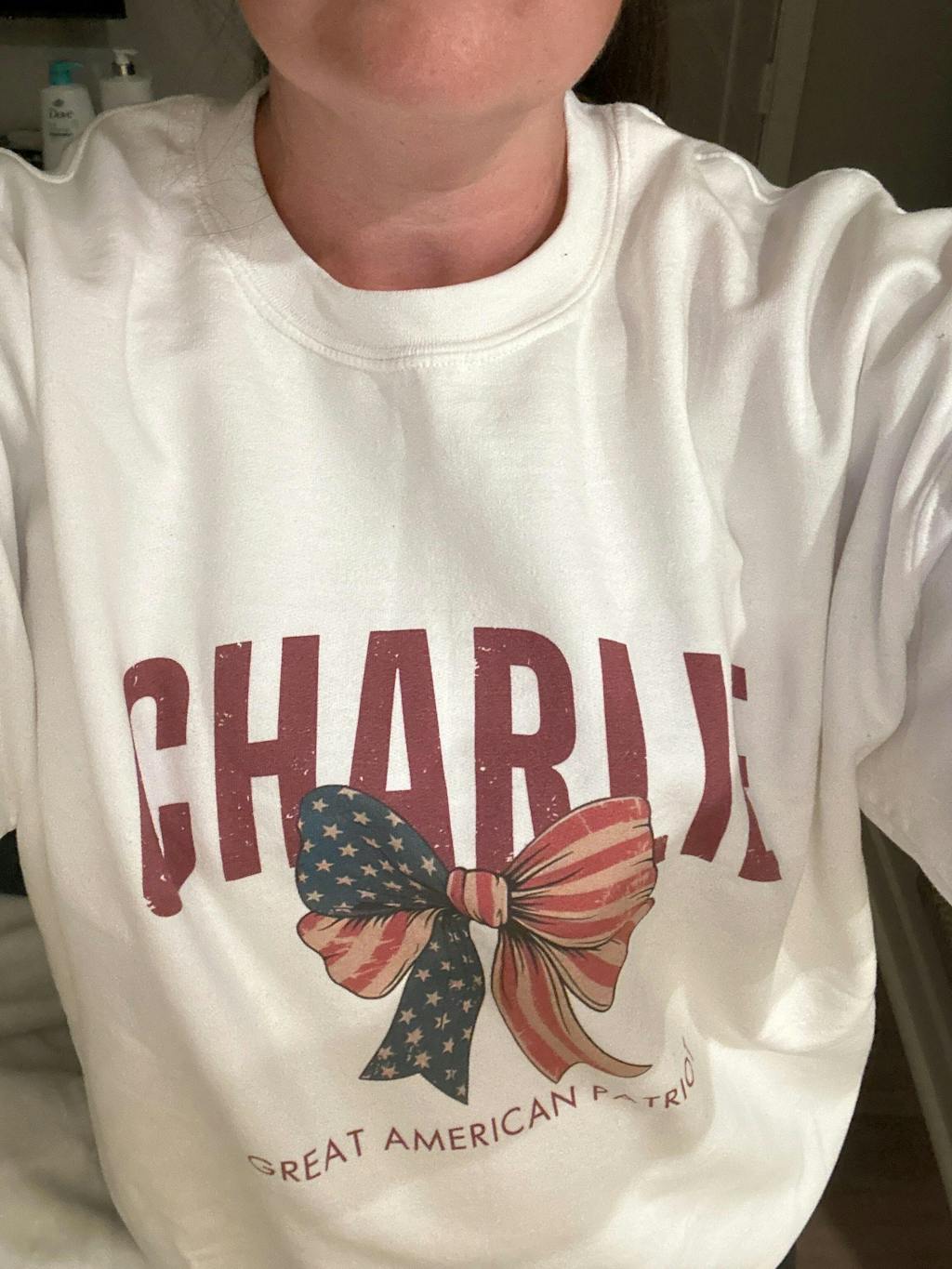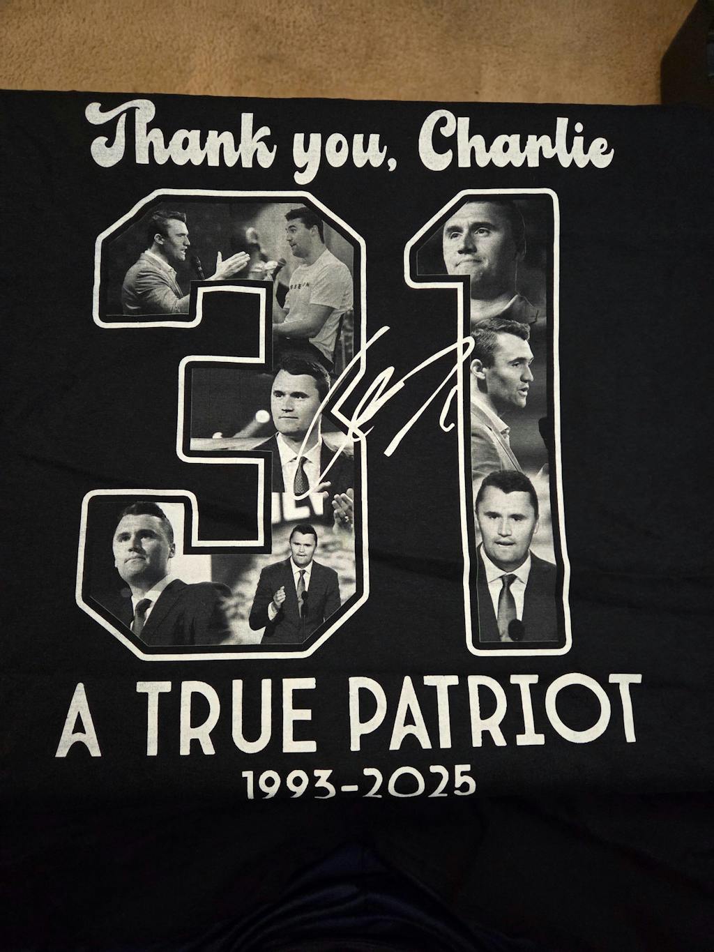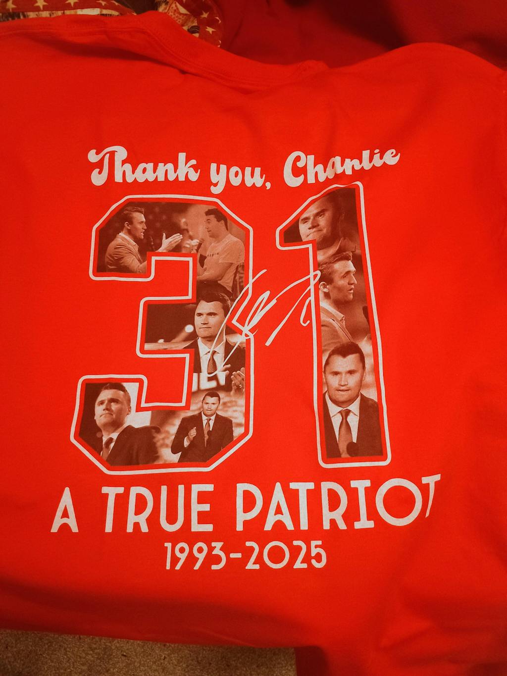 I cried when I saw this T Shirt bought one for me and one for my work friend. Unfortunately we both work for a very large very WOKE company that places much importance on DEI, KROGER. However we are older and we have a few of us that are NOT so we tread lightly. I have watched Charlie for years with Jack Hibbs and many other Pastors here in California where our politicians have literally sold their souls to Satan. We stand strong in our conservative Christian beliefs. My heart aches for Erica and their beautiful babies. I wear this shirt and my Red Freedom shirt all the time proudly.