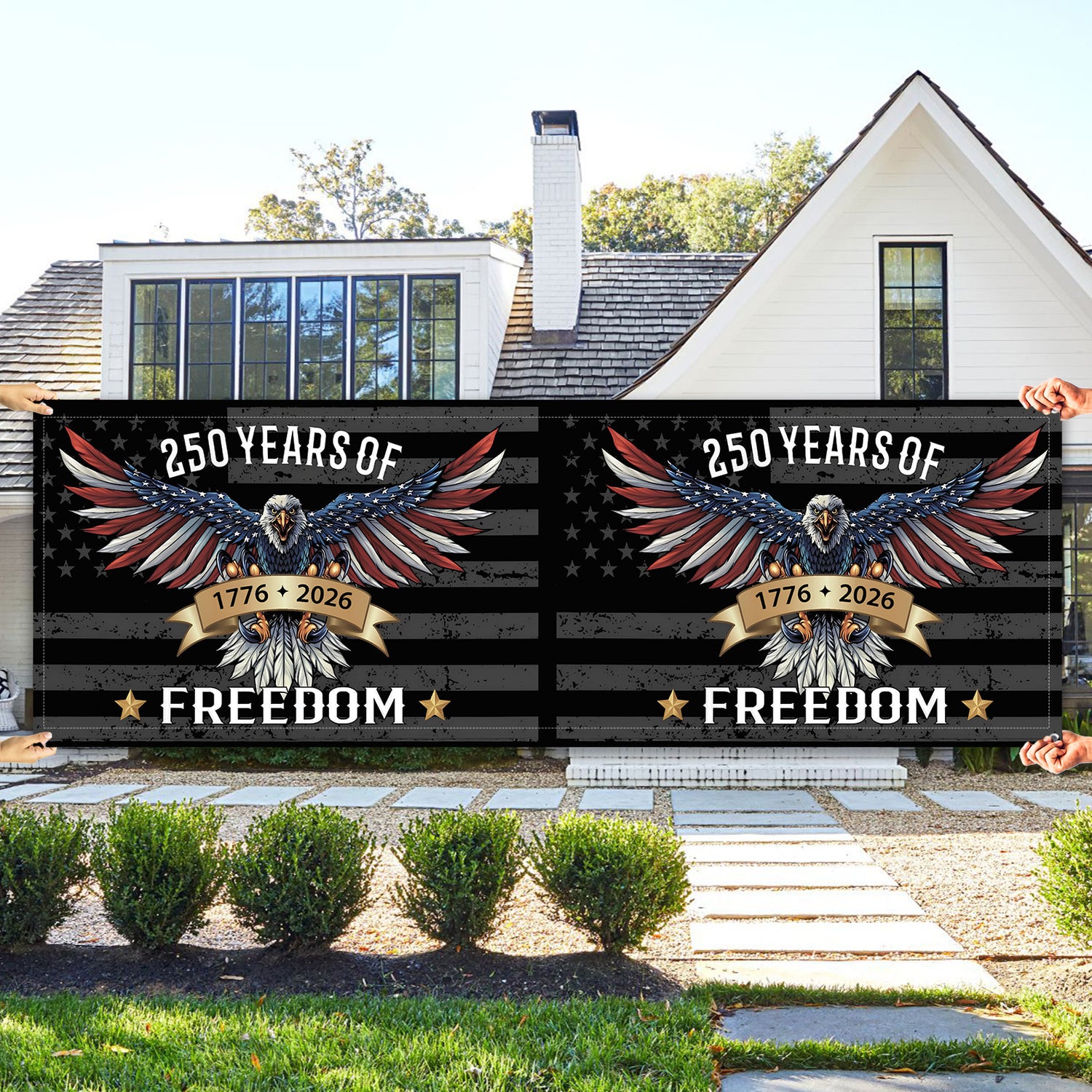Celebrate 250 years of American freedom with this bold 1776–2026 Banner Flag. Featuring a powerful bald eagle, distressed black American flag, and patriotic red, white, and blue details, this 250 Years of Freedom Banner honors the legacy of the United States in a striking, modern way. Perfect for 4th of July decorations, Independence Day celebrations, Memorial Day, Veterans Day, or America’s 250th anniversary, this banner makes a strong statement of pride and patriotism.