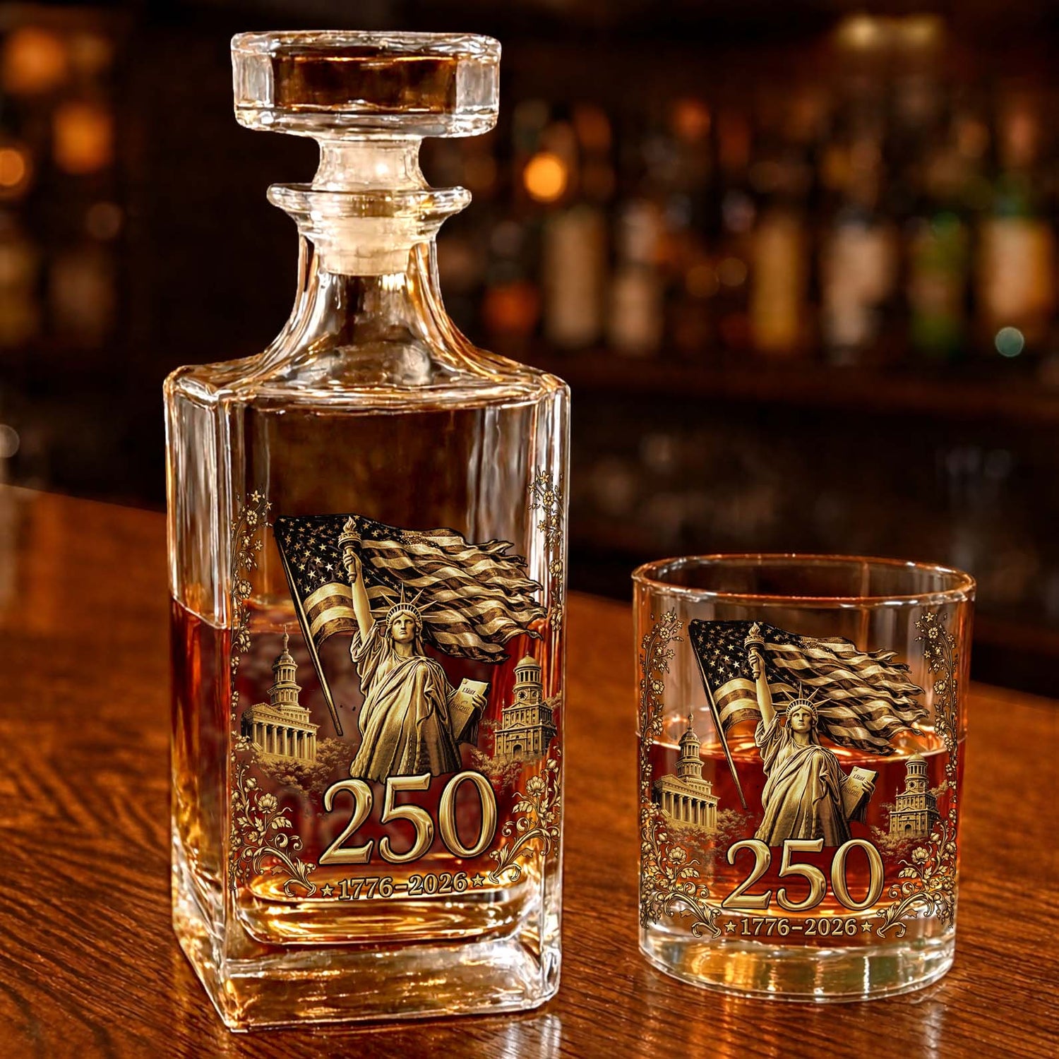 250 Years 1776–2026 Whiskey Decanter Set | Patriotic Liberty US Flag Whiskey Glass Whiskey Bottle 684372