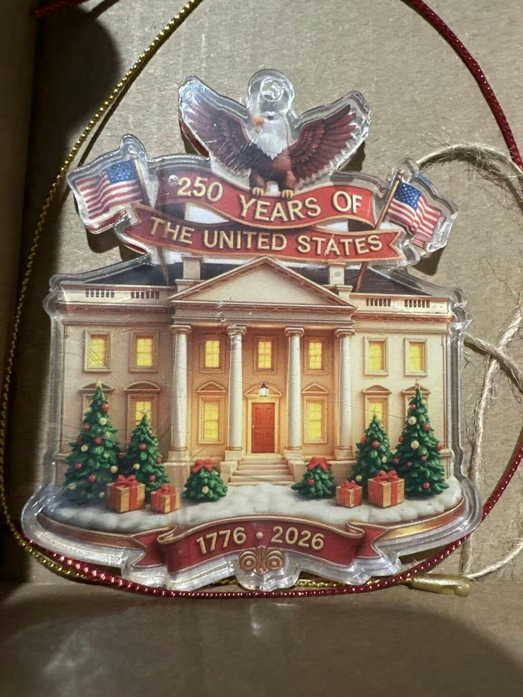 Beautifully crafted with rich details, the ornament features the iconic White House adorned with festive Christmas trees, bright golden windows, and an American bald eagle proudly spreading its wings above a banner that reads “250 Years of the United States.” Two waving flags and a “1776–2026” scroll complete this elegant tribute to liberty and tradition.