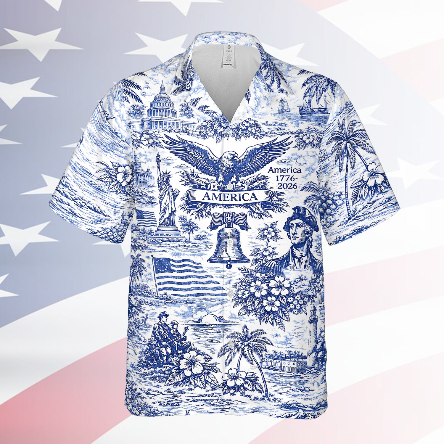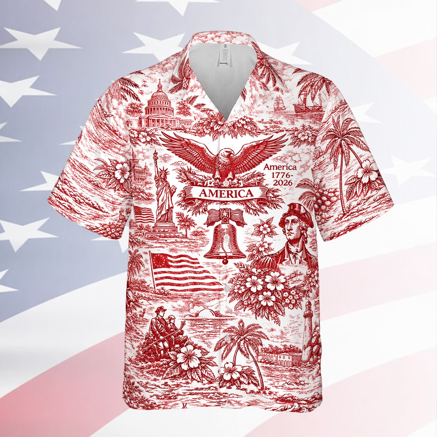 Celebrate America’s 250th anniversary with this vintage patriotic Hawaiian shirt, featuring a detailed all-over print design with eagle, Liberty Bell, historic elements, and tropical scenery that blends American heritage with a relaxed island style. Designed for those who enjoy unique and bold fashion, it’s perfect for 4th of July celebrations, beach vacations, summer parties, or anyone looking for a standout patriotic outfit. Comfortable and eye-catching, this shirt makes a great gift for men, dads, or anyone who loves America and wants to celebrate freedom in style.