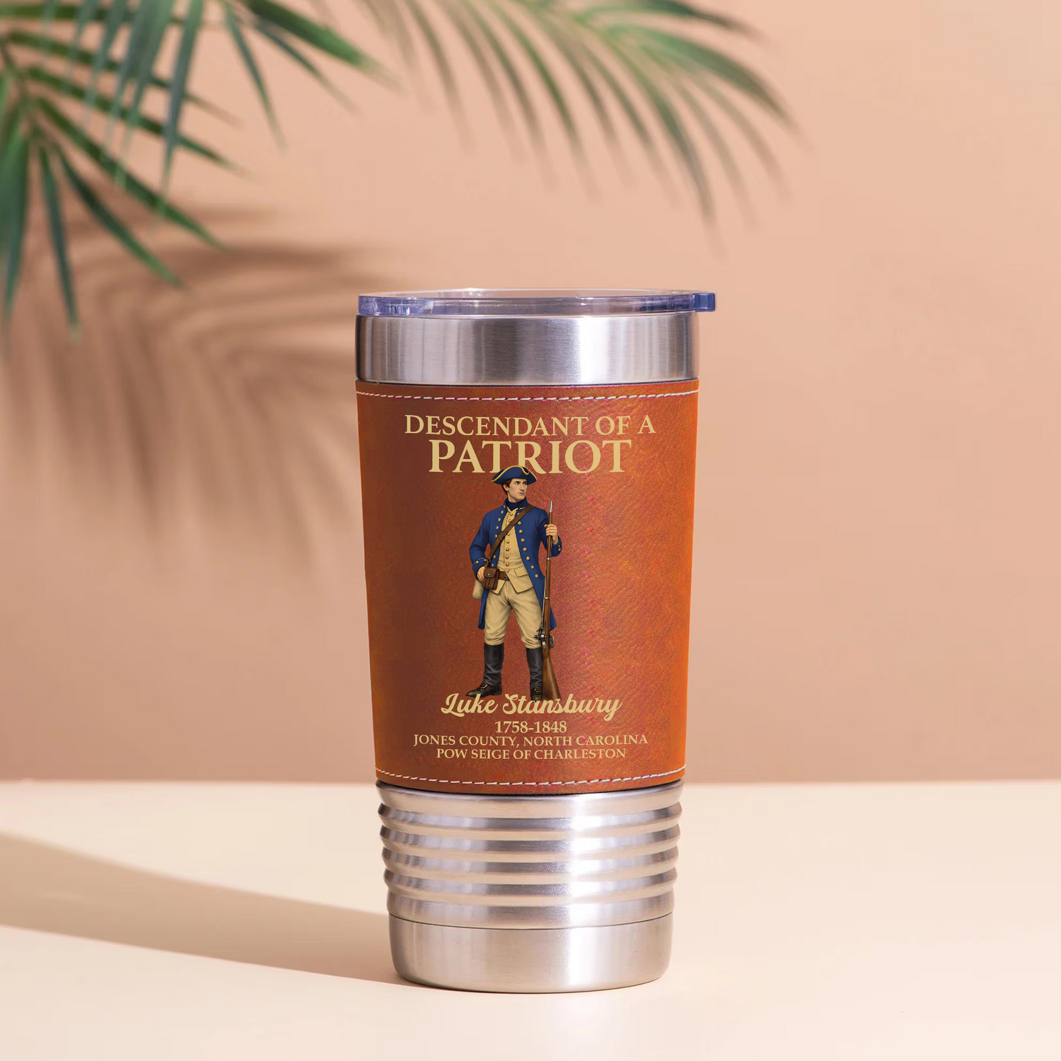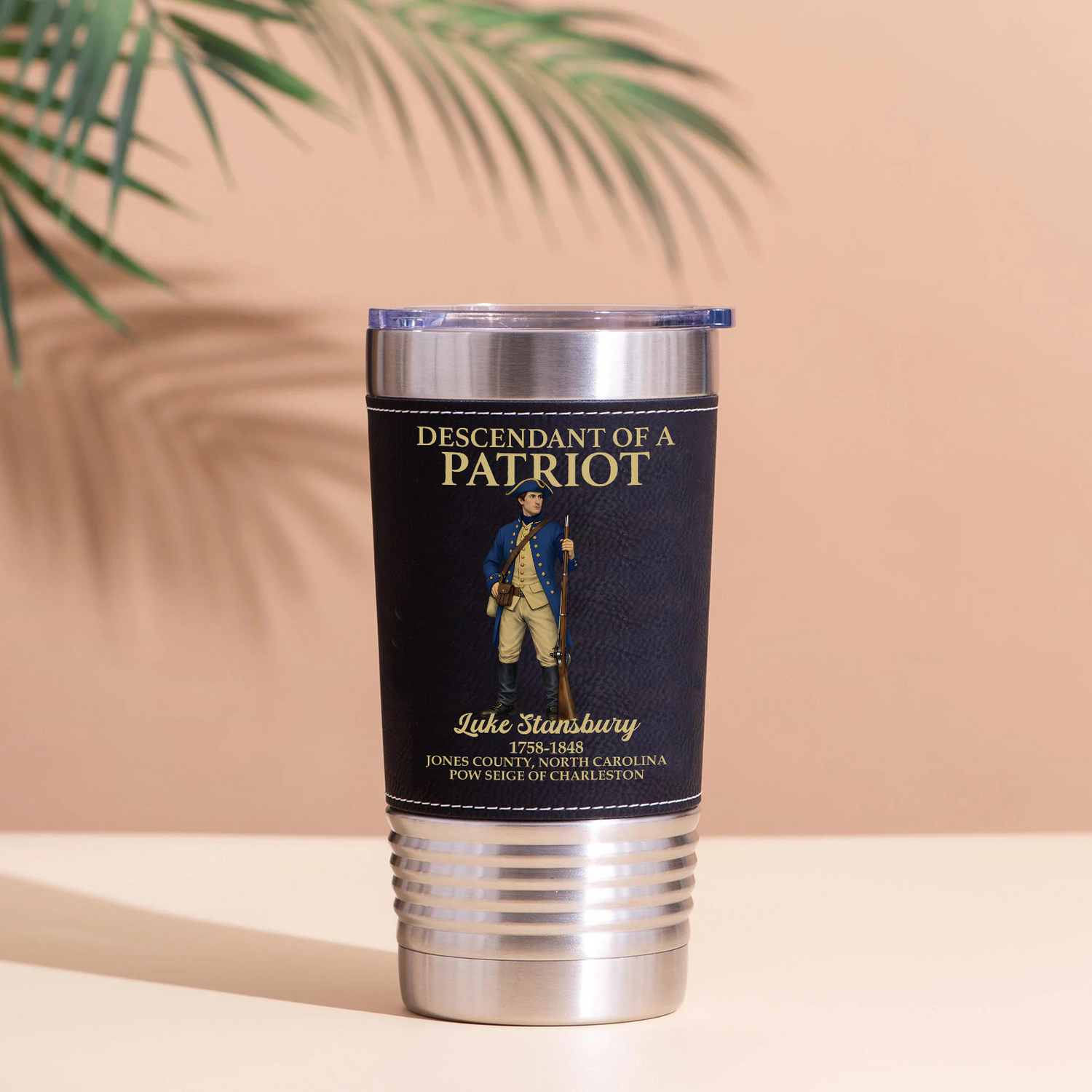 Celebrate your family's rich heritage and the nation's upcoming milestone with this customizable leather tumbler, thoughtfully designed specifically for 250th anniversary commemorations of the United States. Available in both classic black and rustic brown finishes, this stainless steel drinkware features a beautifully detailed illustration of a Revolutionary War soldier standing proudly. Complete with personalized text that proudly declares you a "Descendant of a Patriot"—allowing you to honor your ancestor by adding their name, life dates, and home state—it is a deeply personal and practical everyday keepsake for keeping your favorite beverages at the perfect temperature.