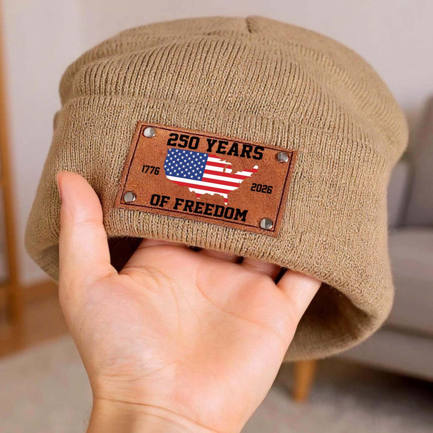 250 Years of Freedom America Beanie | Patriotic Knit Hat with Leather Patch | USA 250th Anniversary Christmas Gift
