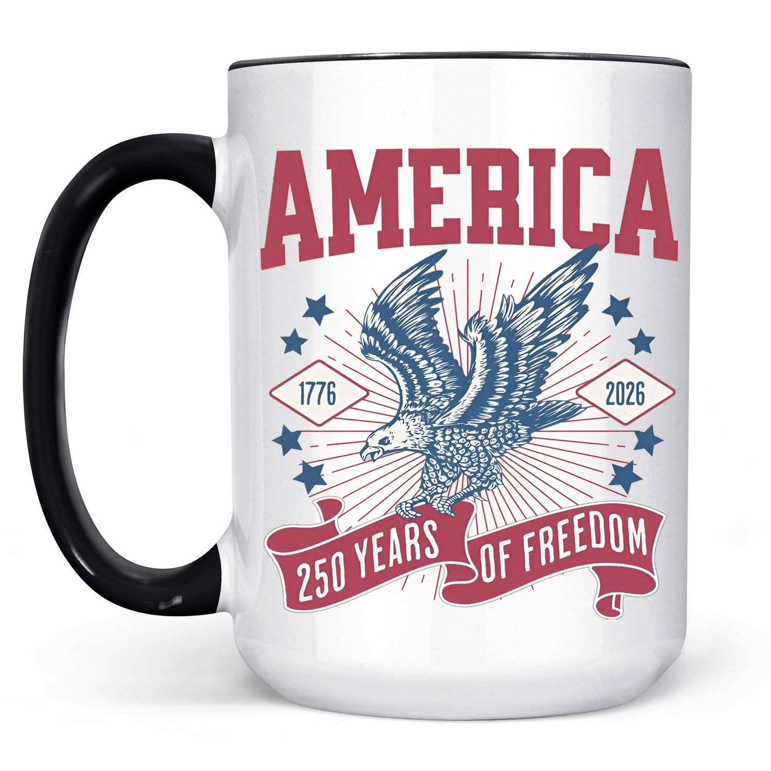 Celebrate the 250th Anniversary of American Independence in style with this powerful “America – 250 Years of Freedom” commemorative mug. Featuring a dynamic bald eagle in flight, surrounded by stars, this patriotic design is a tribute to freedom, strength, and the enduring American spirit.