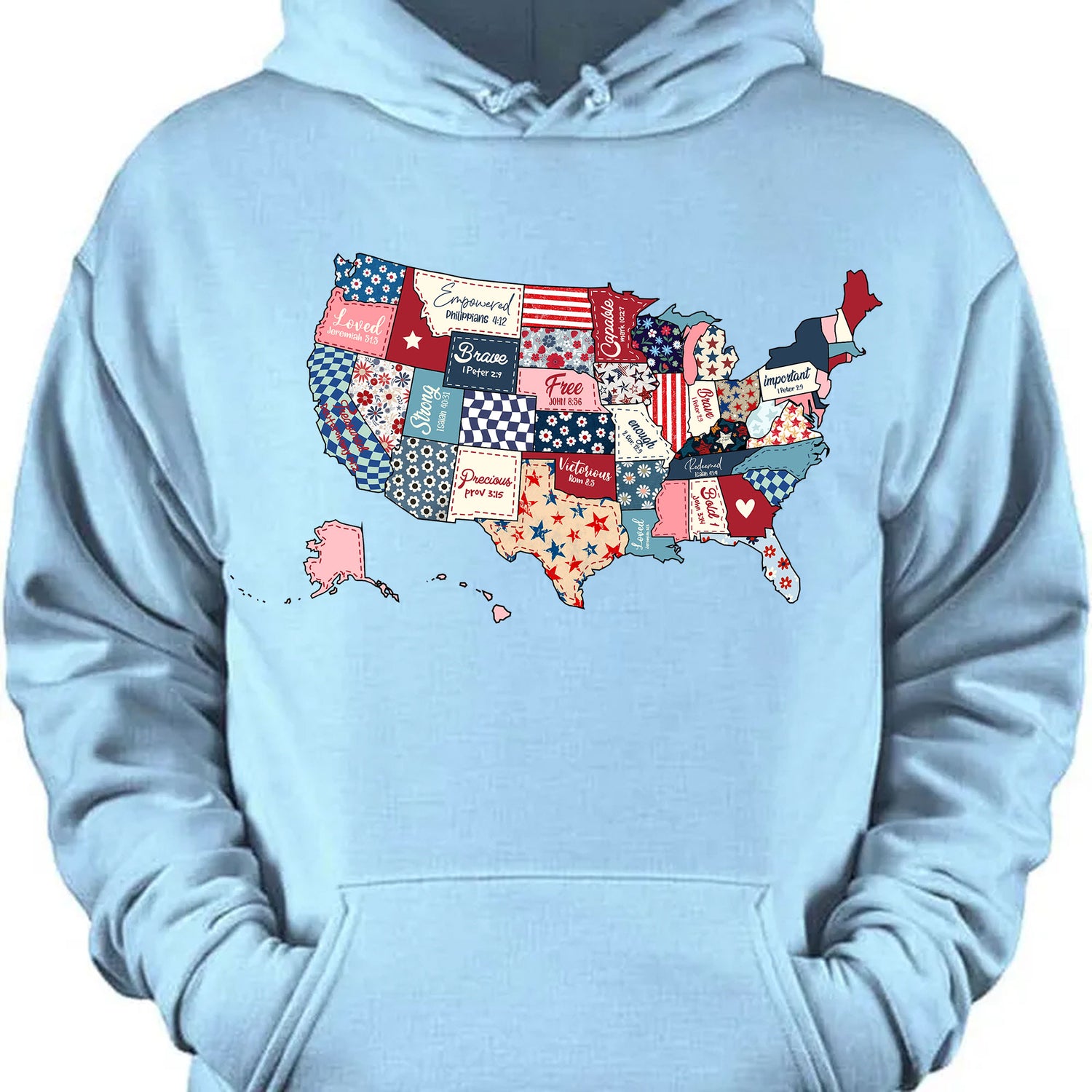 Show your love for the USA with this uniquely designed patriotic T-shirt featuring a vibrant quilt-style map of the United States. Each state is rendered in its own Americana-themed patch, complete with stars, stripes, and uplifting words like “Brave,” “Free,” “Loved,” “Hope,” “Honor,” and “Independence.” Perfect for 4th of July parades, BBQs, Memorial Day, or just showing off your American pride all year long.