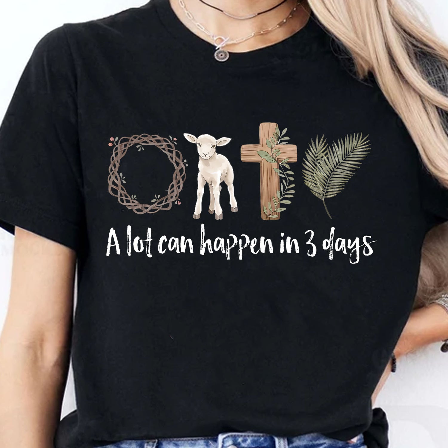 This “A Lot Can Happen in 3 Days” shirt features a meaningful Christian Easter design symbolizing the resurrection story. The artwork combines faith-inspired elements such as the cross, lamb, and crown of thorns, representing the message of hope, sacrifice, and redemption. The design reflects the powerful reminder of the three days between Good Friday and Easter Sunday. Perfect for Easter celebrations, church gatherings, or everyday faith-inspired wear, this Christian T-shirt shares a message of belief, renewal, and the joy of the resurrection.