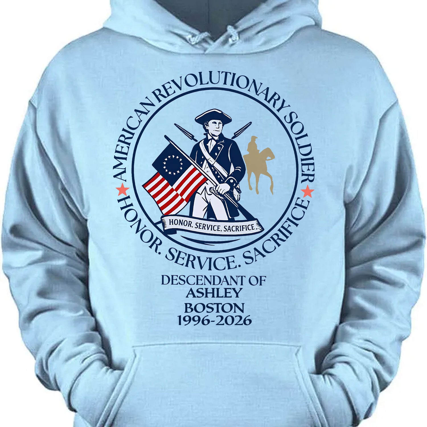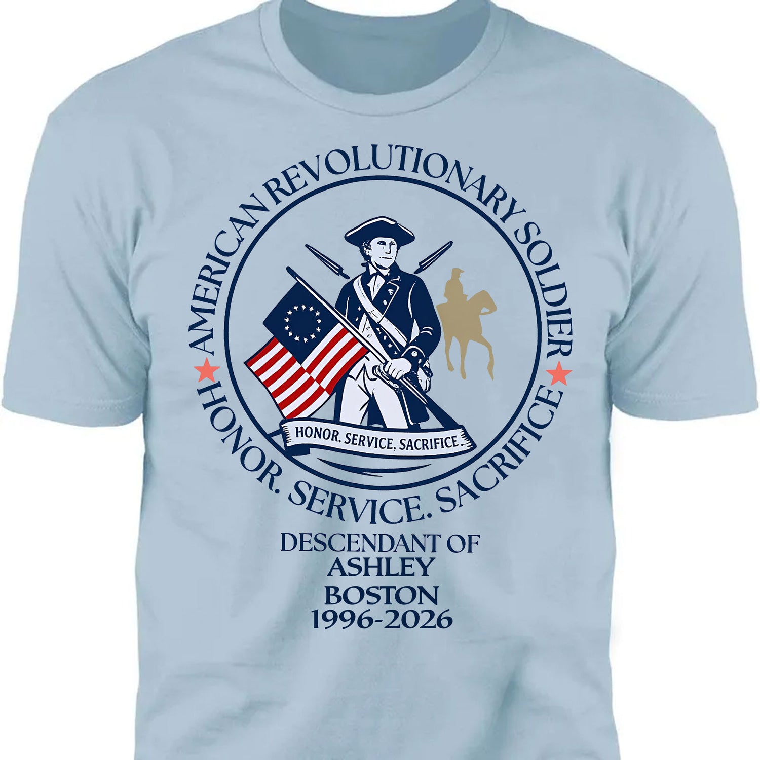 Personalize it with your name, city, and years to create a meaningful, one-of-a-kind keepsake. Whether worn at patriotic events, heritage gatherings, or casual outings, this shirt proudly showcases your connection to America’s founding generation.