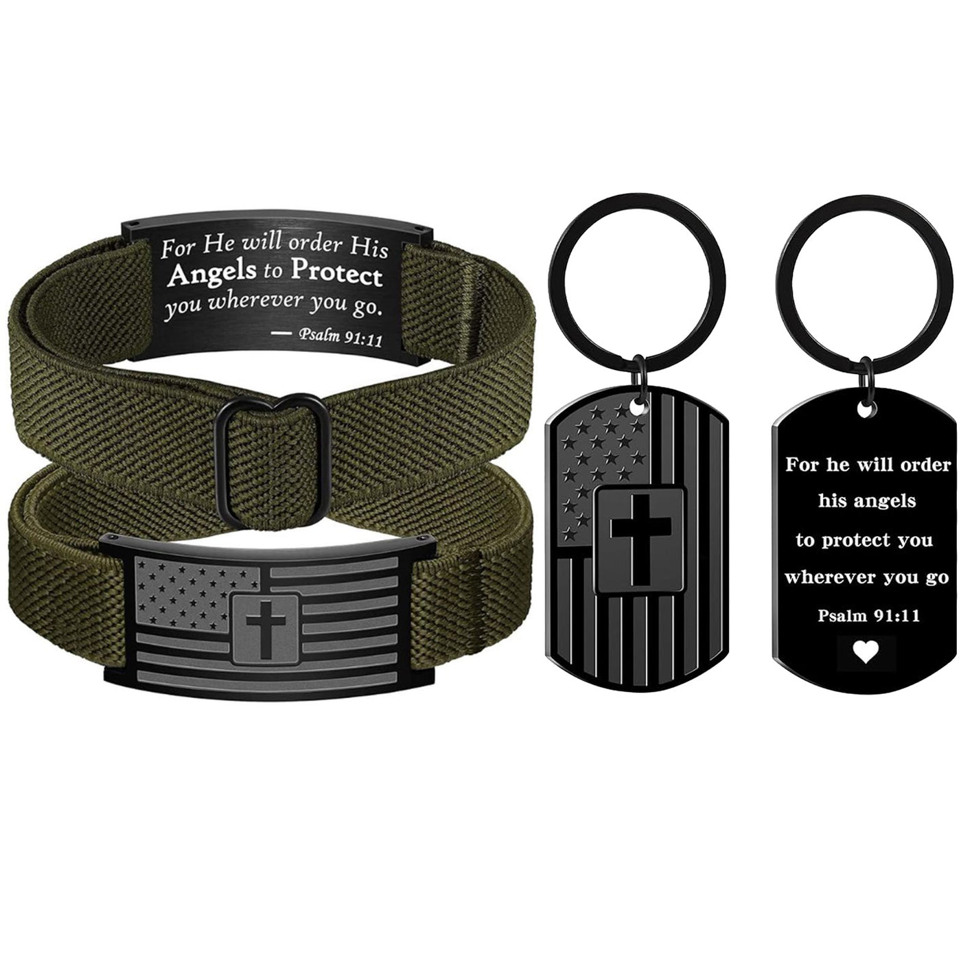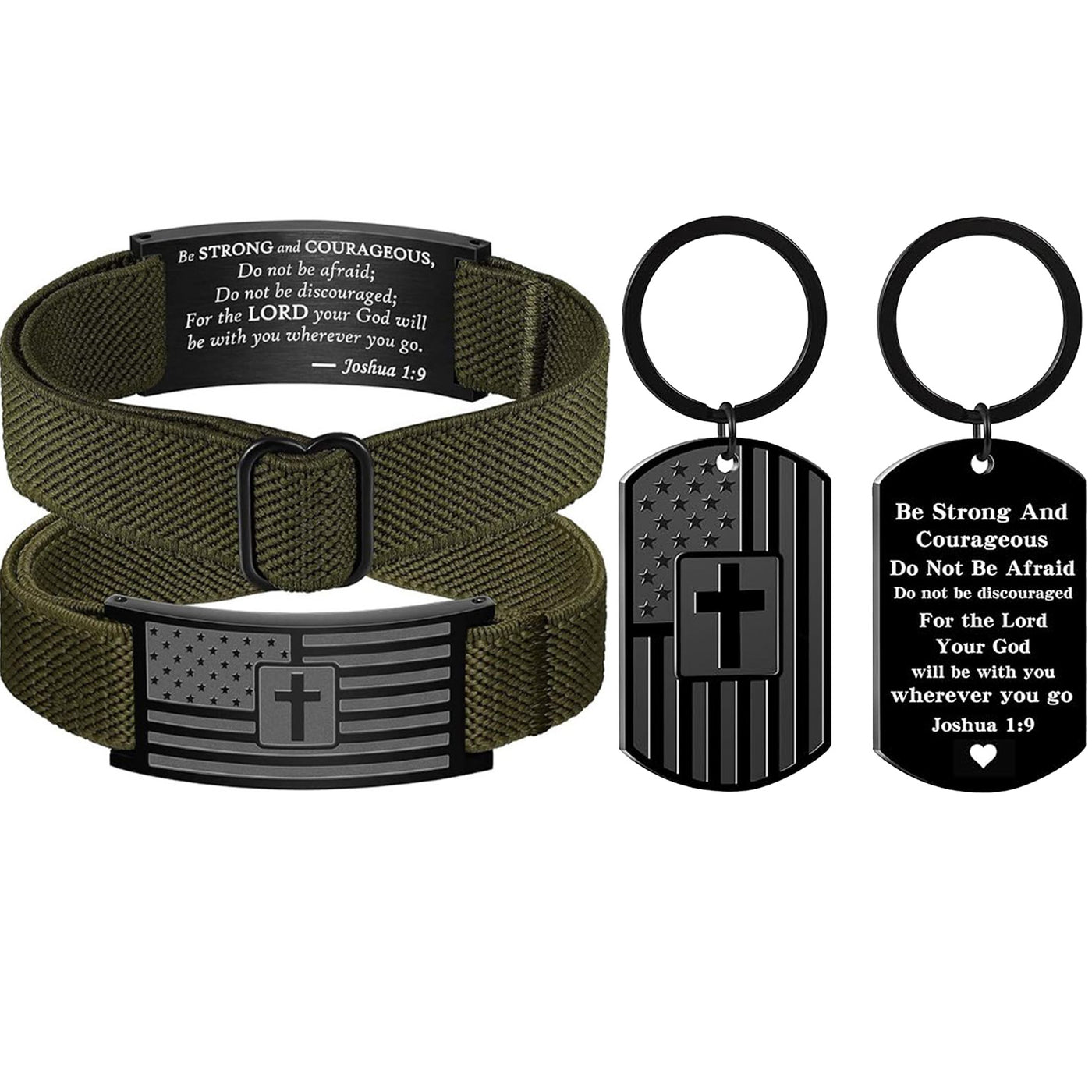 This Christian dog tag keychain is a powerful symbol of faith, strength, and encouragement. Featuring a Bible verse message alongside a cross design and a black American flag detail, it serves as a daily reminder of courage and belief. Durable and easy to carry, this keyring is perfect for keys, bags, or backpacks. Thoughtfully designed as a faith-inspired gift for men, it makes a meaningful present for birthdays, holidays, encouragement moments, or anyone who values Christian faith and patriotic style.