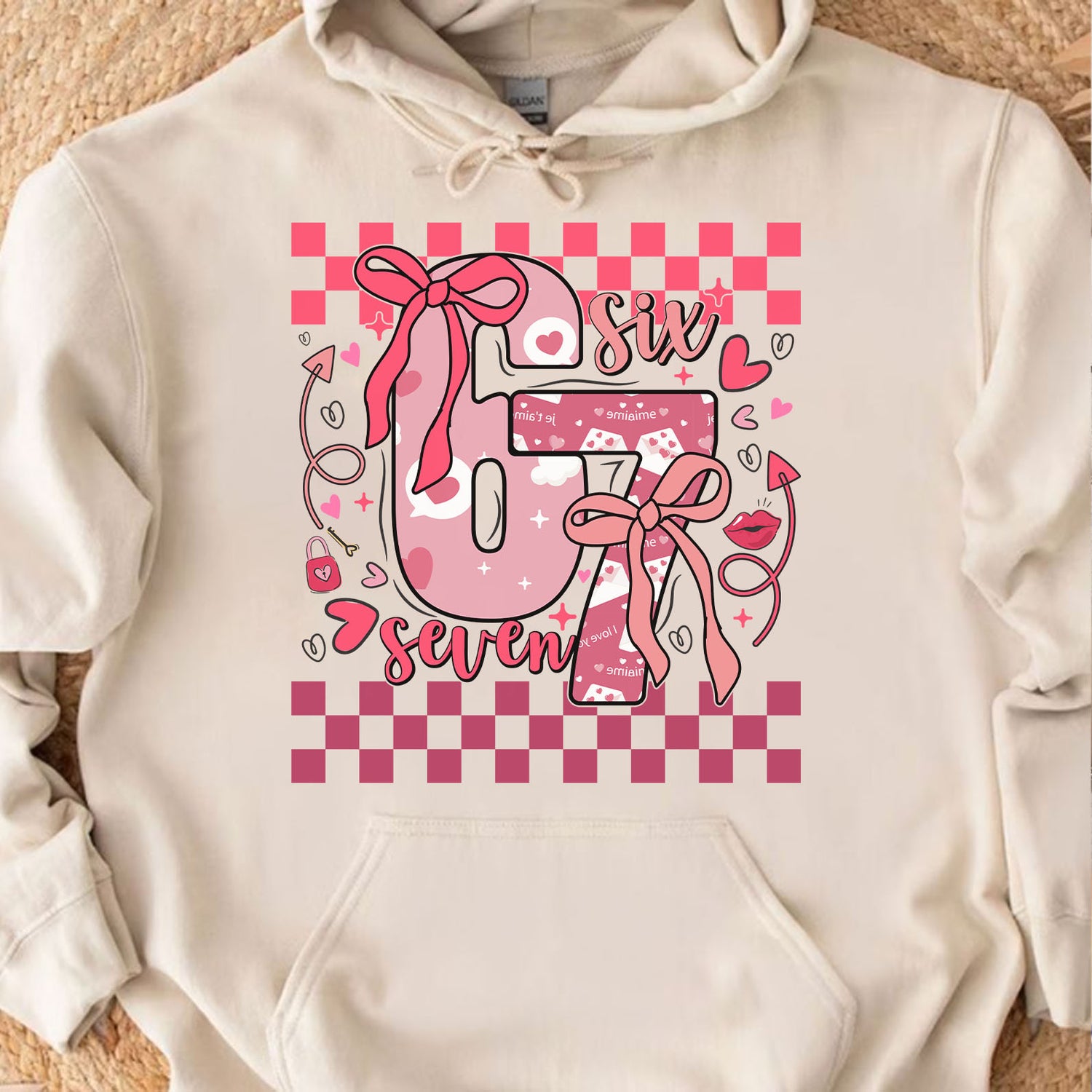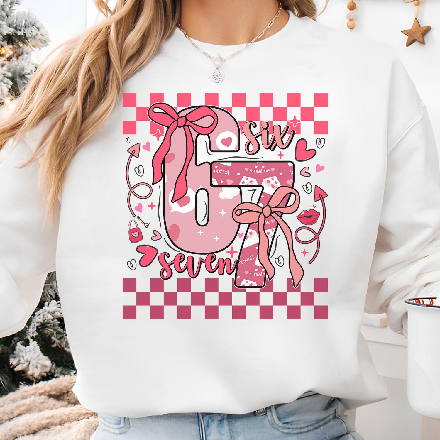This Coquette Valentine “67” Six Seven sweatshirt features a charming mix of hearts, bows, and pink-red checkered details for a sweet and trendy Valentine’s Day look. Designed with a preppy aesthetic and soft romantic colors, it’s perfect for celebrating the season of love in a playful yet stylish way. Comfortable and easy to wear, this shirt or sweatshirt makes a lovely Valentine’s gift or a fun addition to any cozy, festive outfit.