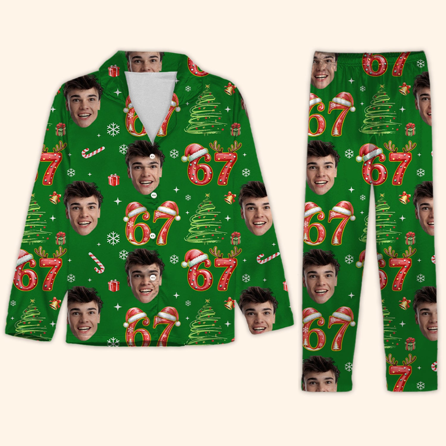 Bring some holiday humor to your wardrobe with these Custom Face Christmas Pajamas featuring the iconic “6 7” meme! Simply upload your photo, and we’ll turn it into a funny, personalized design paired with festive Christmas elements and the trending 6/7 motif. Cozy, unique, and perfect for Christmas gatherings, holiday photos, or gifting to someone who loves a good laugh—these meme-inspired pajamas are sure to make the season even more entertaining!