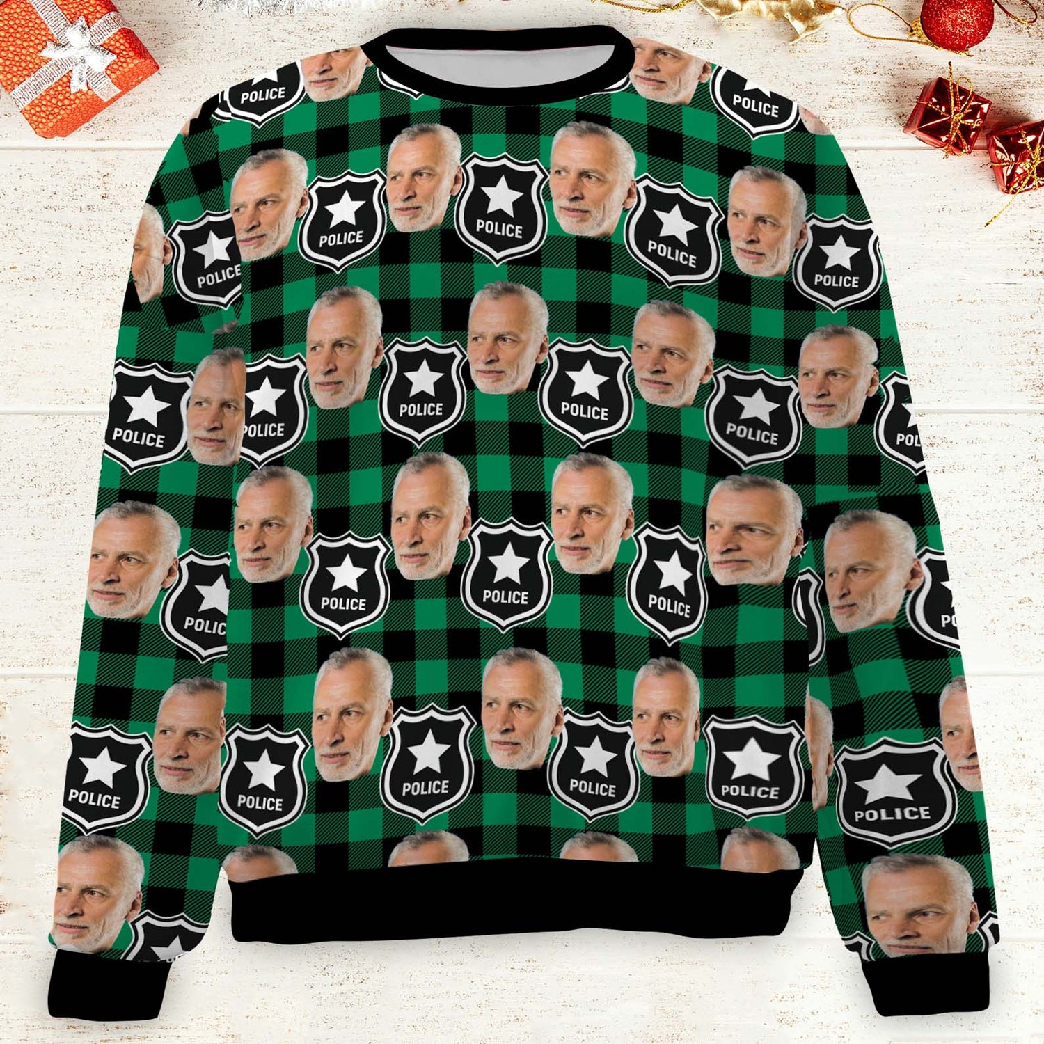 Custom Face Christmas Sweatshirt, Personalized Photo Police Theme Sweater, Christmas All-Over-Printed Sweatshirt