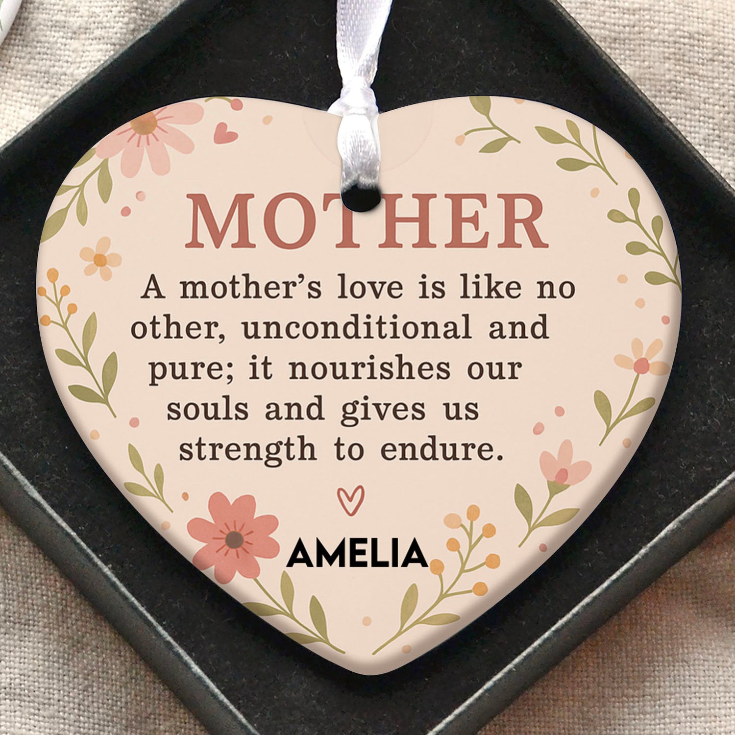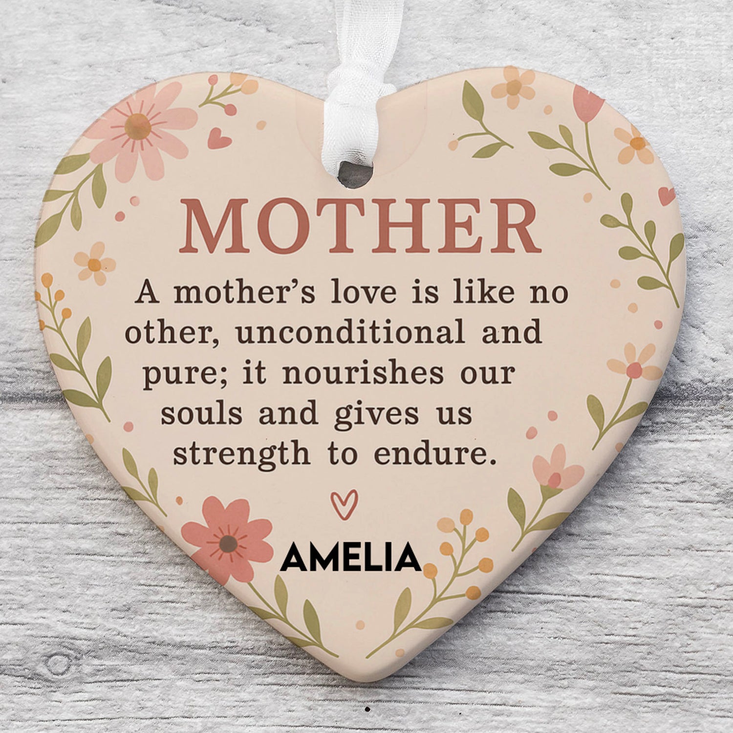 Celebrate the unconditional love of a mother with this beautifully crafted heart-shaped ceramic ornament. Featuring a heartfelt message that expresses love and respect, this keepsake is a touching reminder of appreciation. Below the quote, you can add a custom text to make it even more personal. A wonderful gift for moms, grandmothers, or mother figures, this sentimental piece is sure to warm their hearts.
