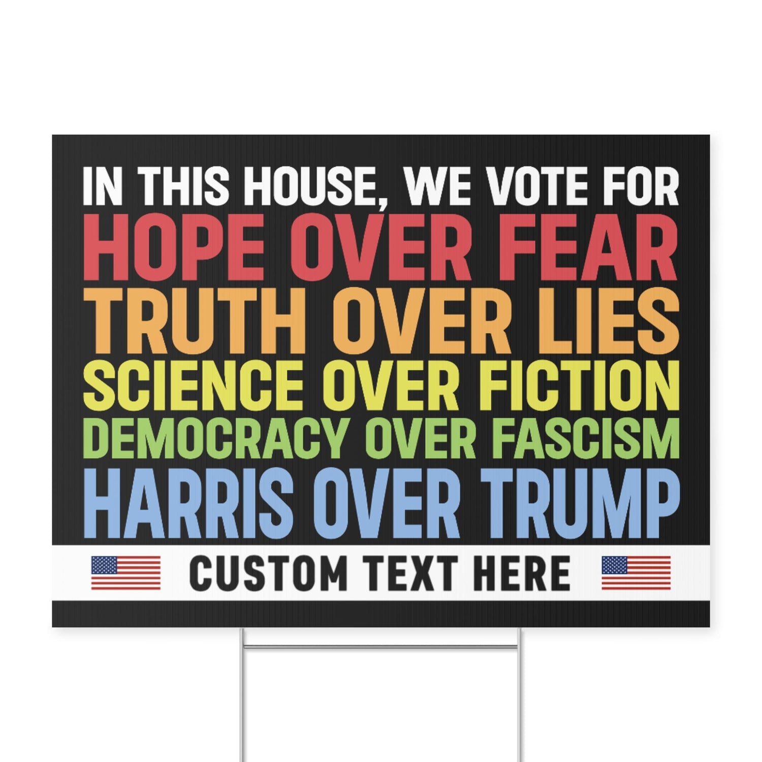 This bold and impactful yard sign makes a clear statement about the values upheld in your household. The message emphasizes choosing "Hope over Fear," "Truth over Lies," "Science over Fiction," and "Democracy over Fascism," making it a powerful declaration of support for truth, progress, and democracy. The colorful text contrasts against the dark background for maximum visibility, and the customizable section at the bottom allows for personalizing with a unique message or slogan.