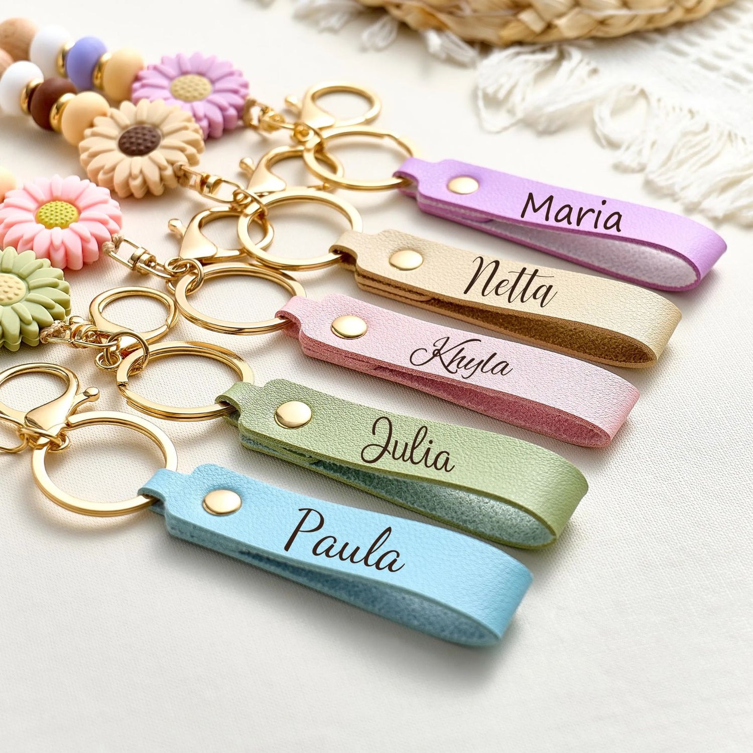Daisy Beaded Keyring For Girls | Personalized Keychain | Faux Leather Keyring | Custom Name Keychain 684765