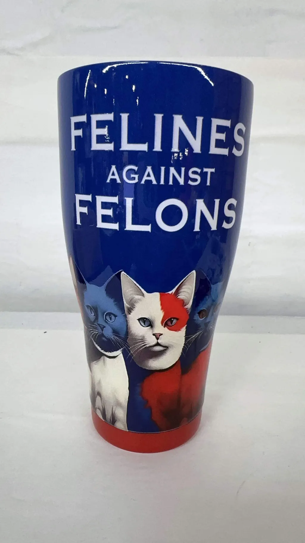 This tumbler design features the playful yet bold phrase "Felines Against Felons" in striking white text, set against a deep blue background. Below the text are three cats, each uniquely colored in blue, white, and red tones, creating a patriotic feel. The central cat has a distinctive red and white split face, standing out as the focal point. With a stylish, fun, and confident design, this tumbler is perfect for cat lovers who appreciate a touch of humor and advocacy!