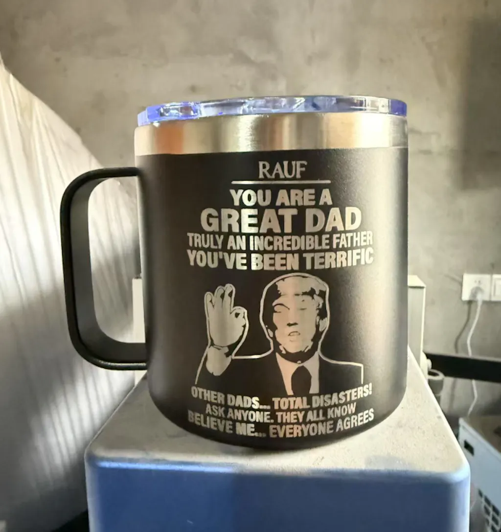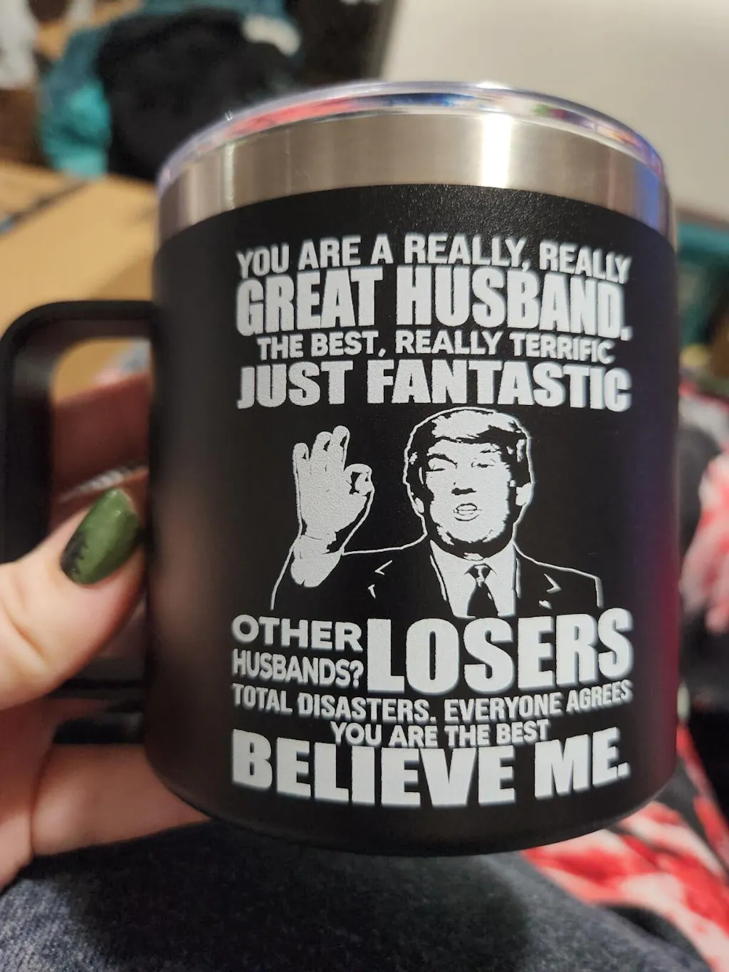 Hi there! Thank you for your review. We are so happy to hear that your husband loved his new insulated tumbler. We take pride in offering unique and high-quality products, and we are glad that this one fit the bill for your husband's Trump collection. Just a quick tip, hand-washing is recommended to keep the tumbler looking and feeling sturdy. Thanks for choosing our product and have a fantastic day!