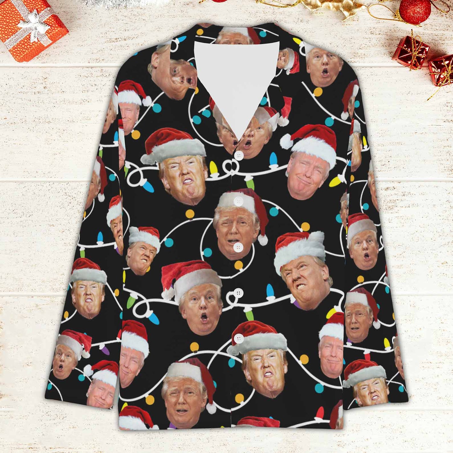Get ready for a laugh with our Funny Trump Face Pajamas, featuring his most popular memes printed in vibrant colors! Perfect for both kids and adults, these pajamas are ideal for cozy nights or festive gatherings. Celebrate your love for humor and politics with a comfortable fit that everyone will enjoy. Whether for a fun family night or a quirky gift, our Trump pajamas are sure to bring smiles. Available in various sizes for all ages—order yours today and embrace the fun!