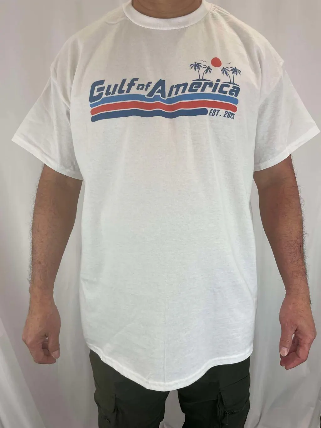 Embrace a retro vibe with our "Gulf of America" shirt a playful and bold statement piece with a vintage twist! This cream-colored sweatshirt features a striking design inspired by classic Americana, showcasing the phrase "Gulf of America" in a sleek, futuristic font. Palm trees, a sunset, and bold orange and blue stripes bring a laid-back, beachy feel, while the "Est. 2025" detail adds a fun, forward-looking touch. Perfect for trendsetters, beach lovers, or anyone who enjoys a clever twist on classic designs.