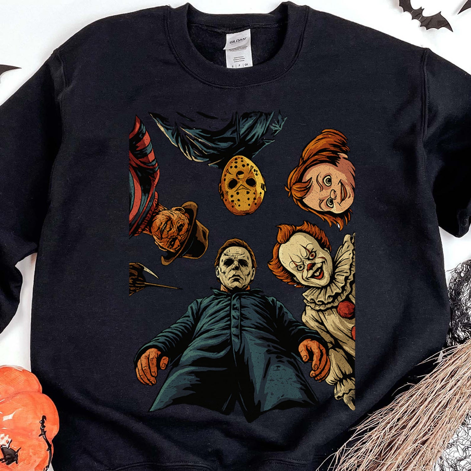 The vivid artwork showcases detailed, comic-style characters that bring spine-tingling nostalgia and dark humor to your wardrobe. Whether you’re wearing it for Halloween, movie nights, or just to show off your love for horror legends, this shirt is a killer choice.