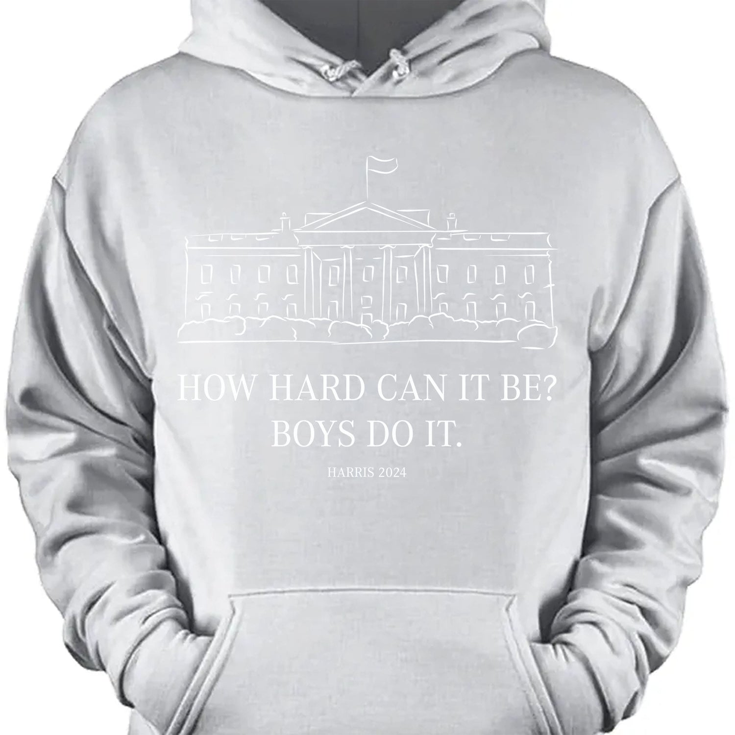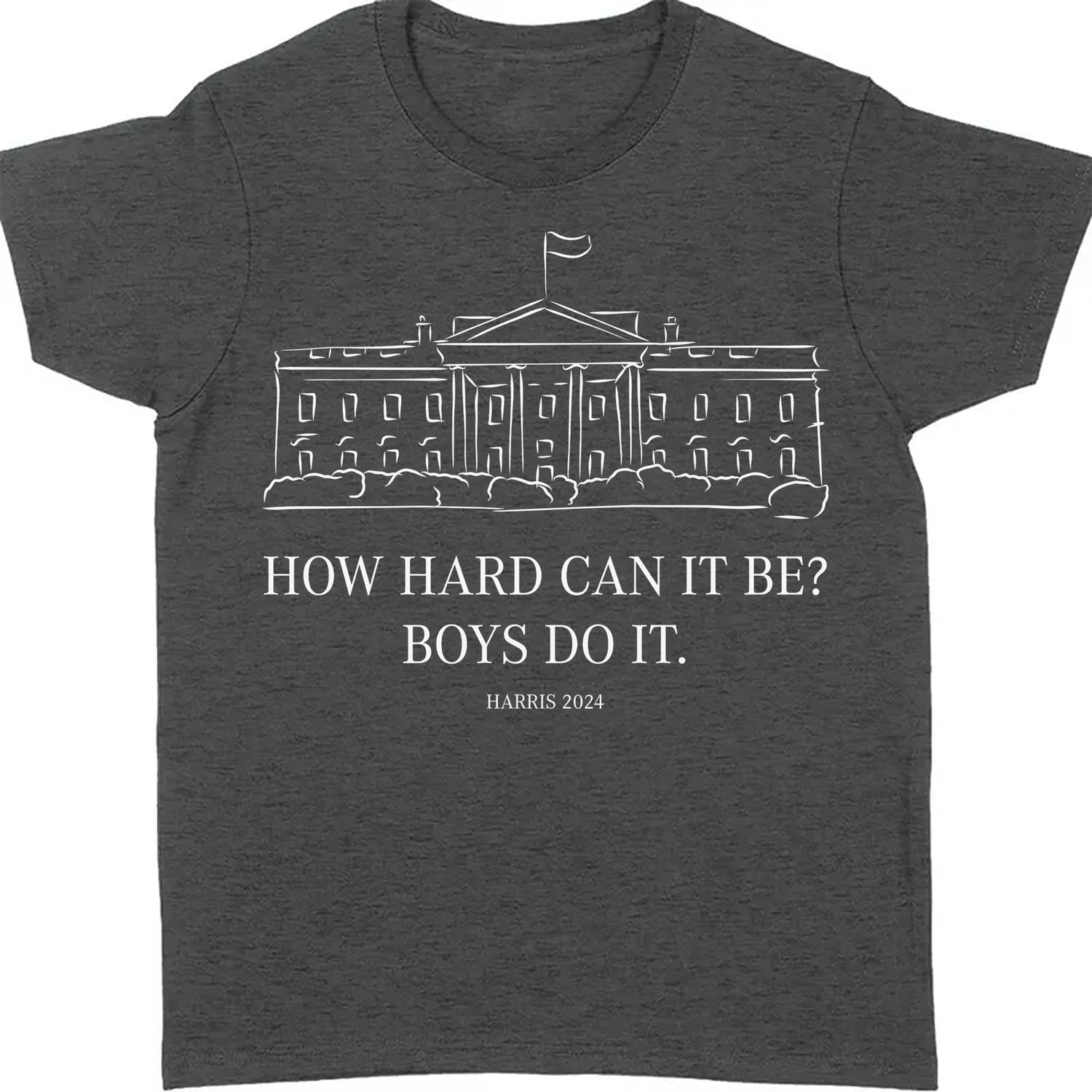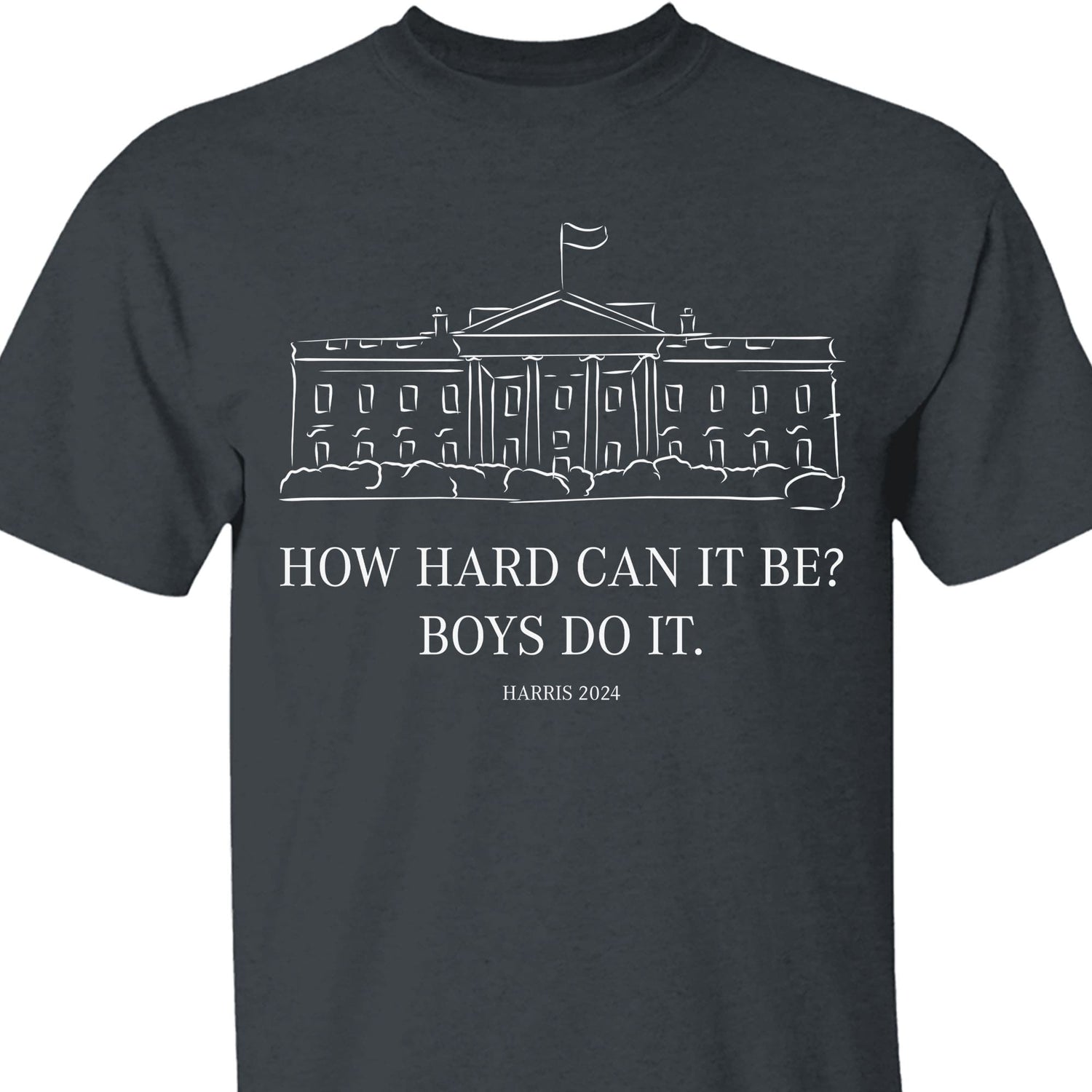 This t-shirt design features a minimalist yet powerful sketch of the White House, with the words "How hard can it be?" displayed just below. Beneath that, the phrase "Boys do it" adds a bold statement, and at the bottom, "Harris 2024" ties the message together, all in a clean, white color scheme. This design is perfect for making a strong political statement while keeping a sleek and modern look. Ideal for supporters of Kamala Harris and those advocating for change in 2024.
