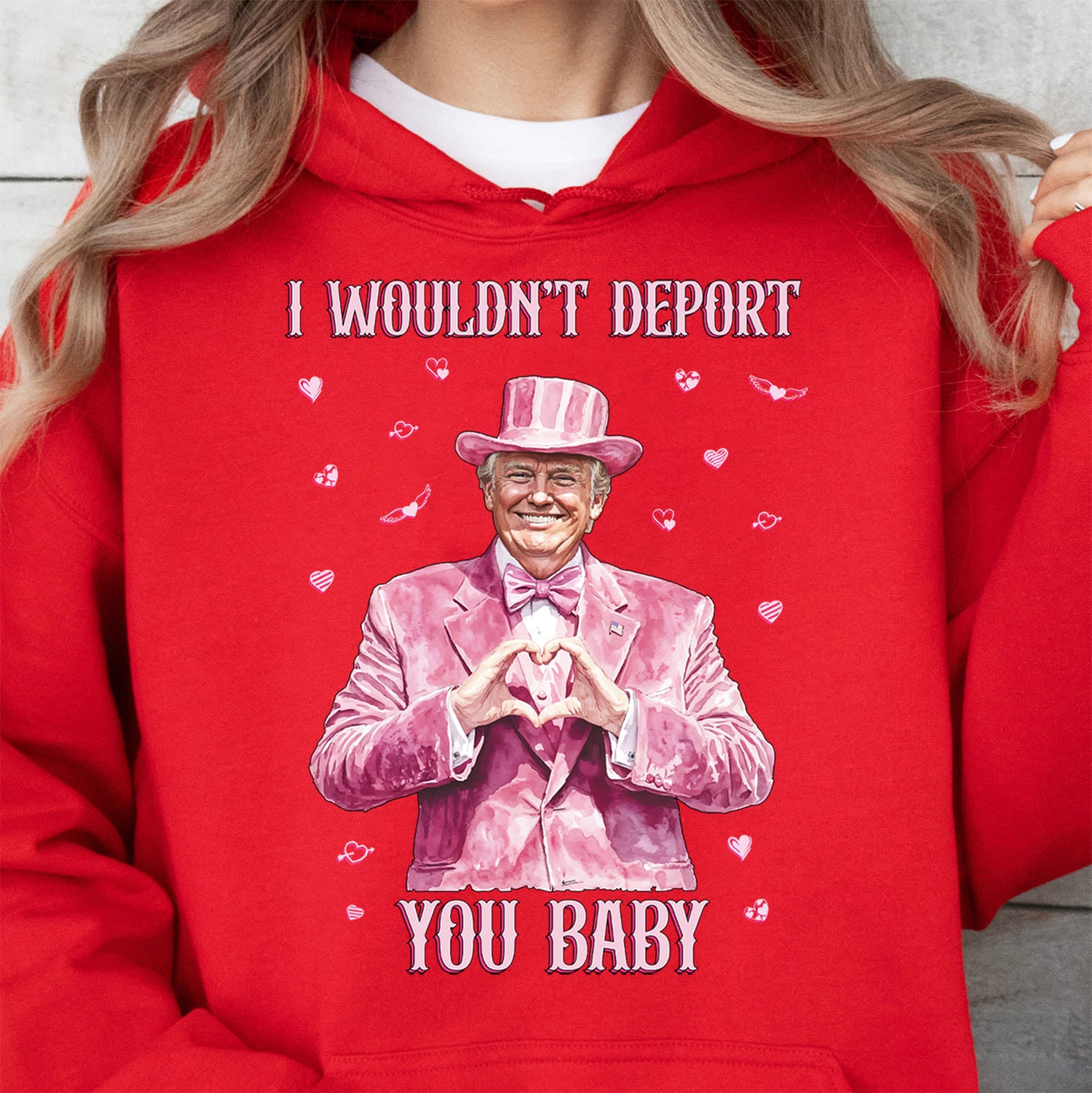 This sweatshirt design features a humorous and whimsical image of Trump dressed in a pink, velvet-textured suit, complete with a matching top hat and bowtie. The character makes a heart shape with his hands and is surrounded by small heart icons and playful elements like lips and Cupid arrows in white and pink tones. The text above reads "I WOULDN'T DEPORT," and below the image is "YOU BABY," both written in bold, vintage-style white lettering with pink accents. The bright color sweatshirt serves as a vibrant background, enhancing the playful and lighthearted tone of the design.