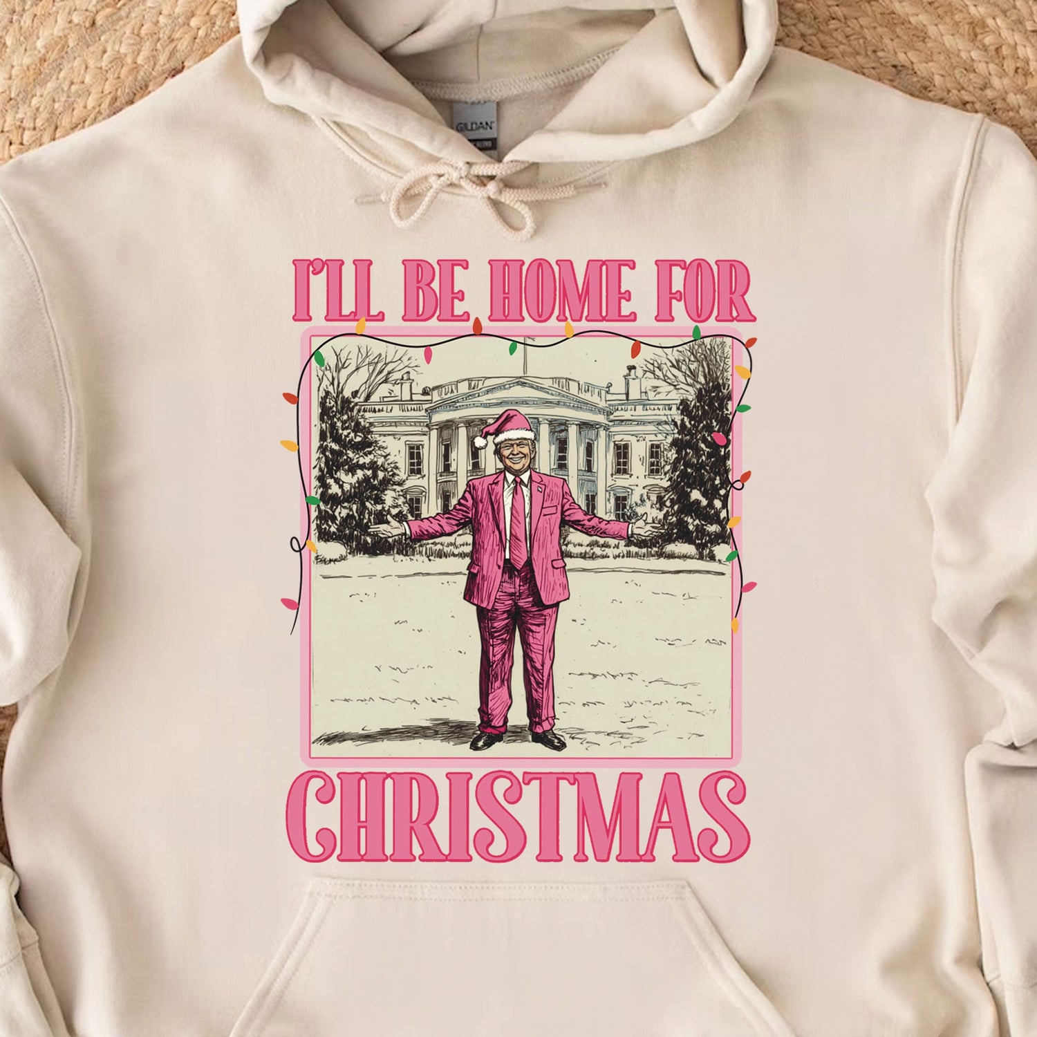 This sweatshirt design features a festive illustration of Trump in a bright pink suit and Santa hat standing with his arms outstretched in front of the White House, which is decorated for the holidays with snow on the ground. Above the scene, the phrase "I'LL BE HOME FOR" is written in bold pink letters, while "CHRISTMAS" is displayed at the bottom in the same bold pink font. The illustration is bordered by a string of colorful Christmas lights, adding a cheerful holiday vibe to the design.