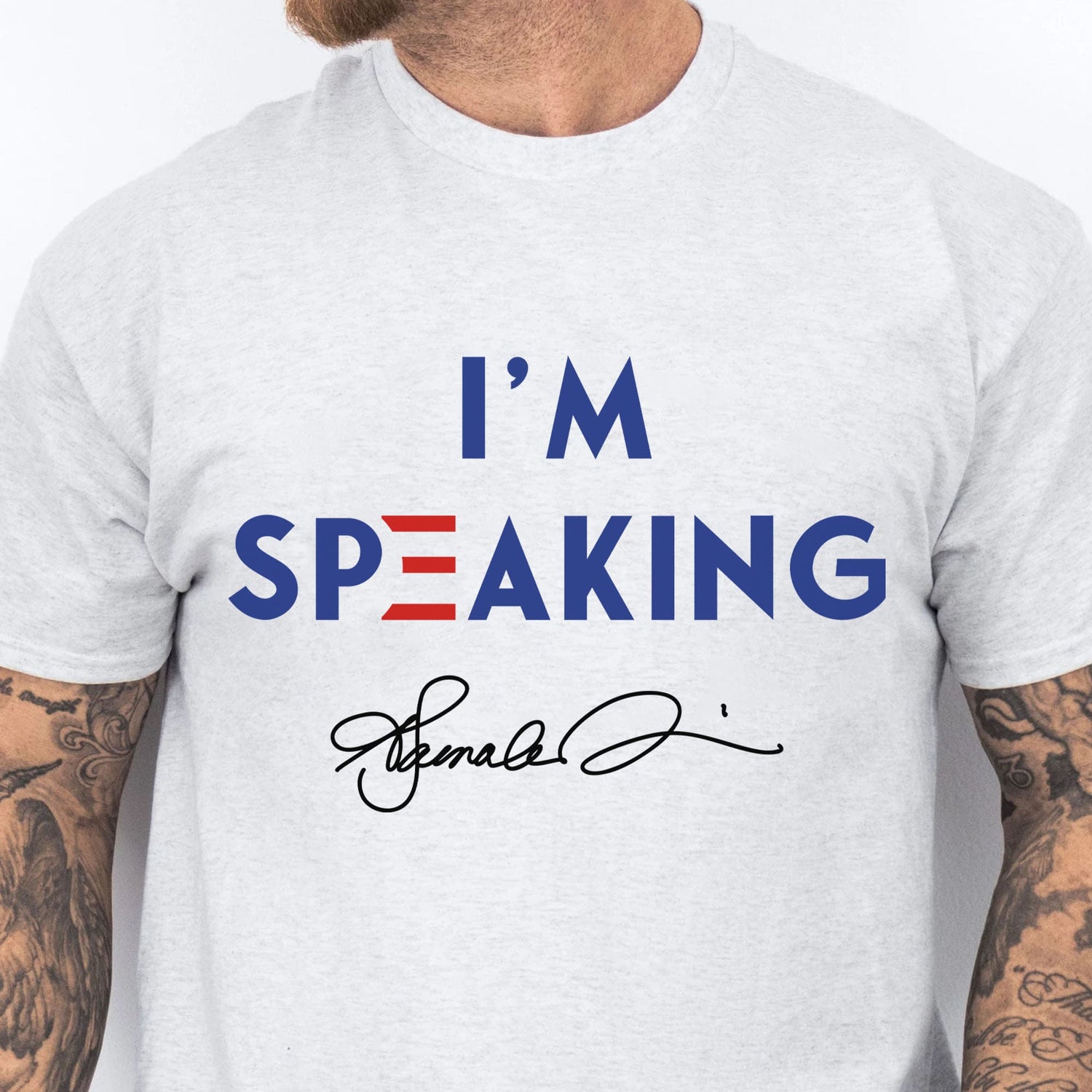 Make a bold statement with this vibrant tee that embodies empowerment and patriotism. The shirt features the phrase 'I'm speaking' in a striking blue font, with each 'e' highlighted in red to mirror the colors of the American flag. Below this powerful declaration, Kamala Harris's signature adds an inspiring touch, making this shirt a perfect blend of style and significance. Wear it proudly and let your voice be heard!