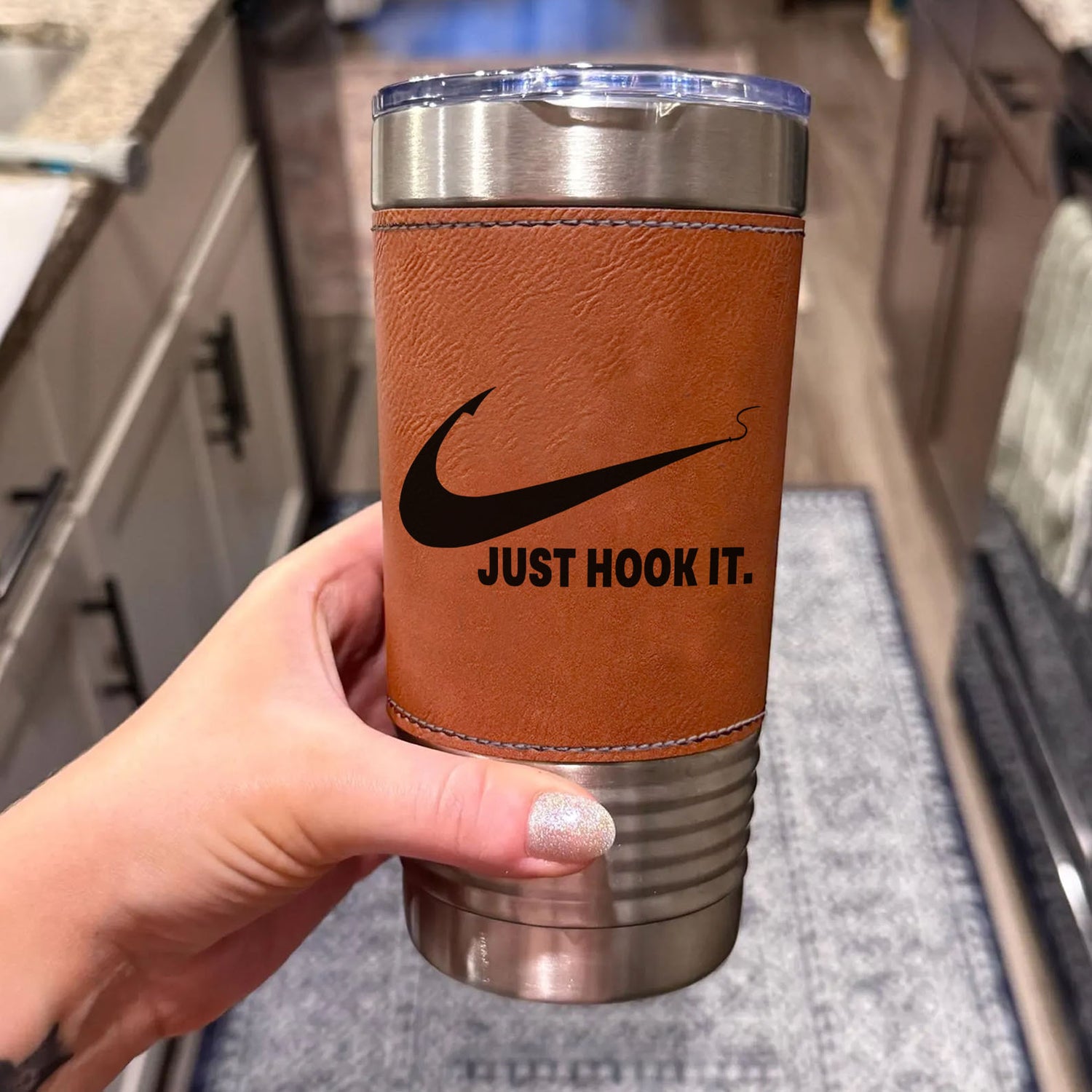 Perfect for anglers with a sense of humor, this leather-wrapped tumbler features the clever phrase “Just Hook It.” A fun twist on a familiar slogan, it’s made for those who’d rather be fishing than doing just about anything else. Whether it’s morning coffee before hitting the water or a cold drink after a long day of casting, this tumbler delivers style and function.