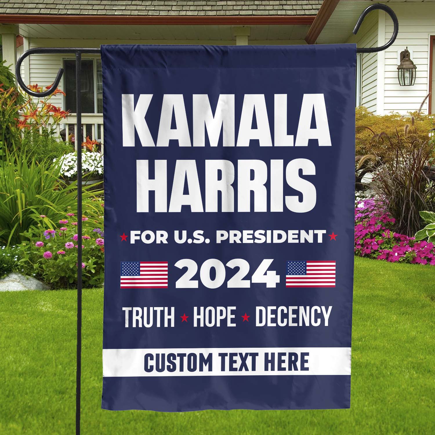 This flag design prominently showcases "Kamala Harris" in bold, large font at the top. Beneath her name, the phrase "for U.S. President" is displayed between two red stars, creating a balanced and patriotic touch. Below that, the year "2024" is featured in big, bold numbers, flanked by two U.S. flags on either side. Underneath, the words "truth hope decency" are aligned, each separated by a red star, and the customizable section at the bottom allows for personalizing with a unique message or slogan. Join the movement, show your pride, let's elect Kamala Harris and shape a future built on truth, hope, and decency.