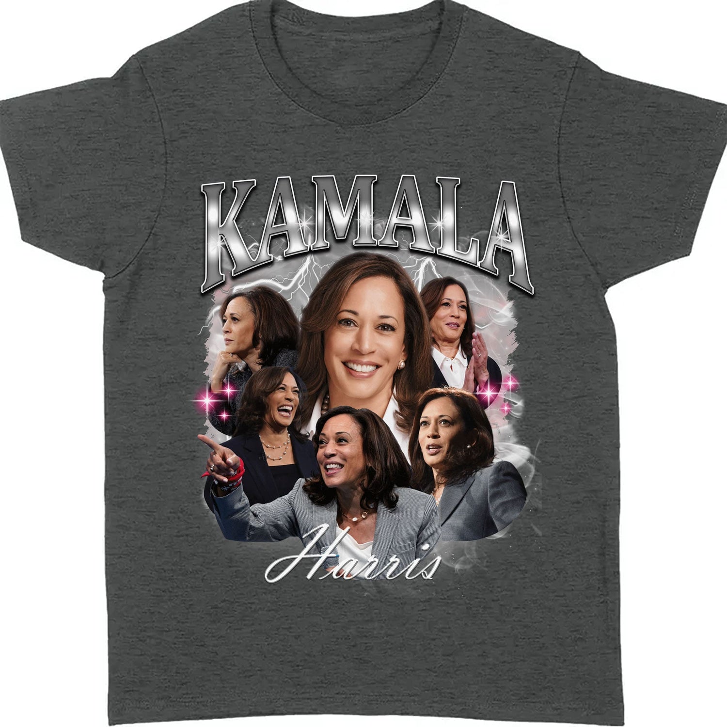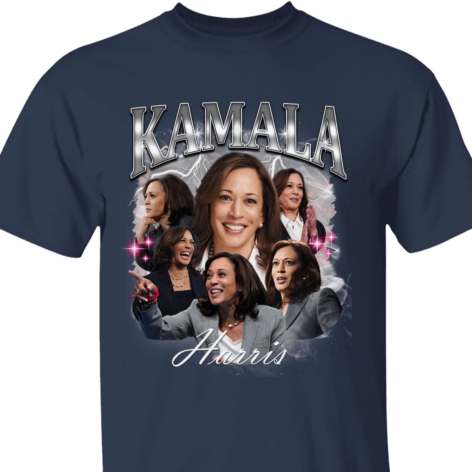 This bold and empowering t-shirt design features multiple dynamic images of Kamala Harris, capturing her in various moments of expression and leadership. The word "Kamala" is prominently displayed at the top in large, metallic lettering with a lightning effect in the background, adding an electrifying vibe to the design. The center showcases a confident and smiling portrait of Kamala, surrounded by smaller images that highlight her strength, charisma, and determination. Below the portraits, the name "Harris" is elegantly scripted, tying the entire design together. This shirt is a powerful tribute to Kamala Harris, celebrating her influence and resilience.