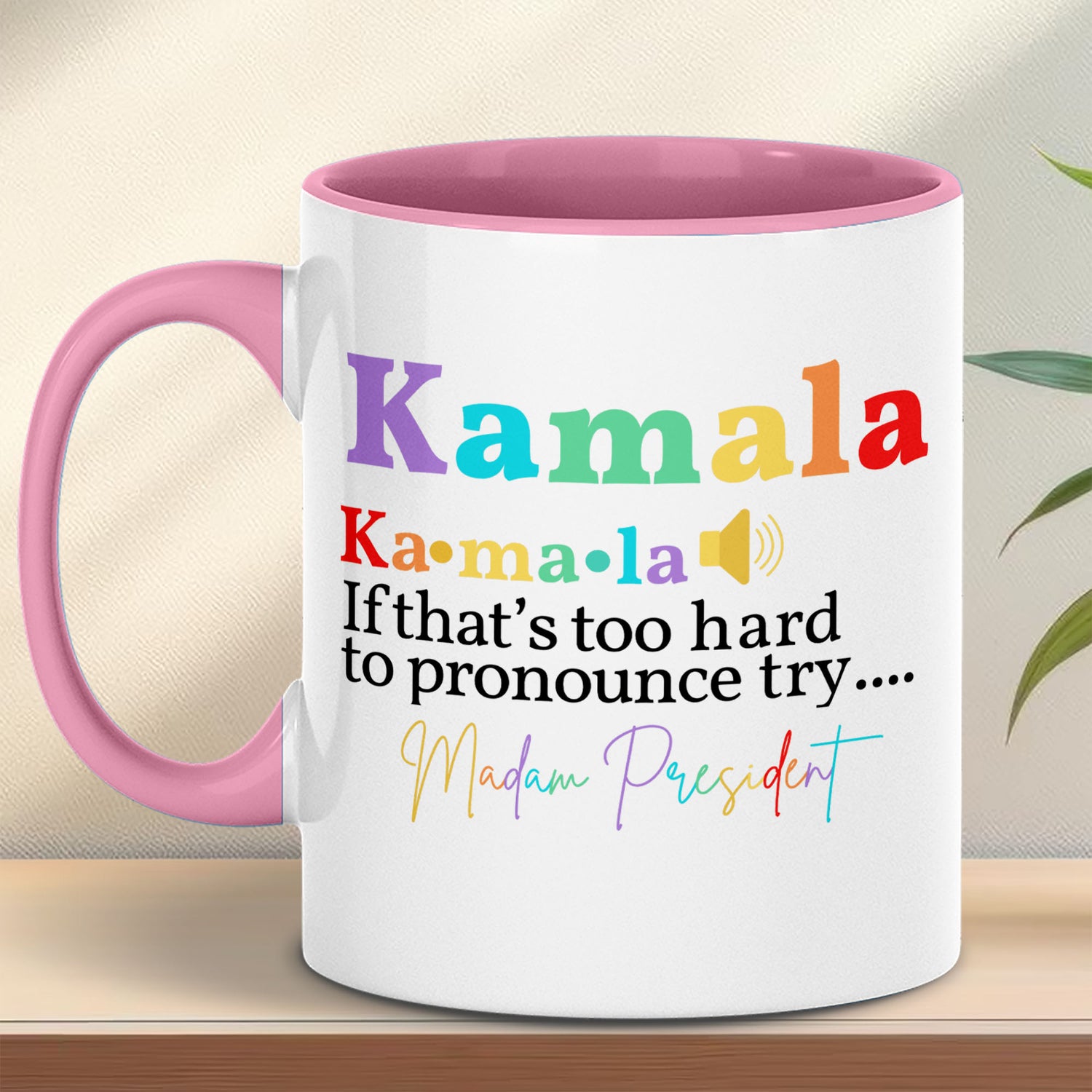 This mug features a vibrant and bold message of support for Kamala Harris, showcasing her name in a rainbow of colors at the top. Below "Kamala," there is a phonetic pronunciation guide "Ka·ma·la" with a speaker icon, emphasizing how to say her name correctly. The text humorously follows with "If that's too hard to pronounce try...." and finishes with "Madam President" in elegant, multicolored script. Perfect for enjoying your beverage and showing your support for Kamala Harris.