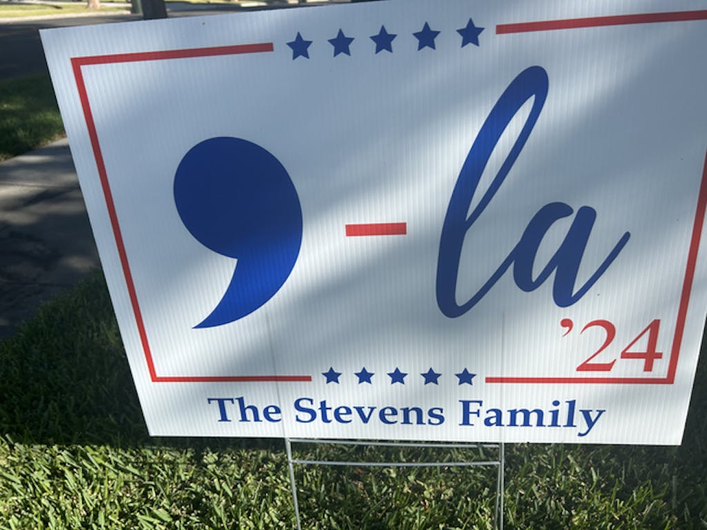 Support Kamala Harris in her campaign for the White House with this unique and stylish yard sign. The design features a bold, blue comma symbol followed by "la," symbolizing Kamala, with the year "'24" highlighted in red to mark the election year. The sign is bordered with patriotic red and blue accents, including stars at the top and bottom, and offers space for custom text, allowing you to personalize your message of support.