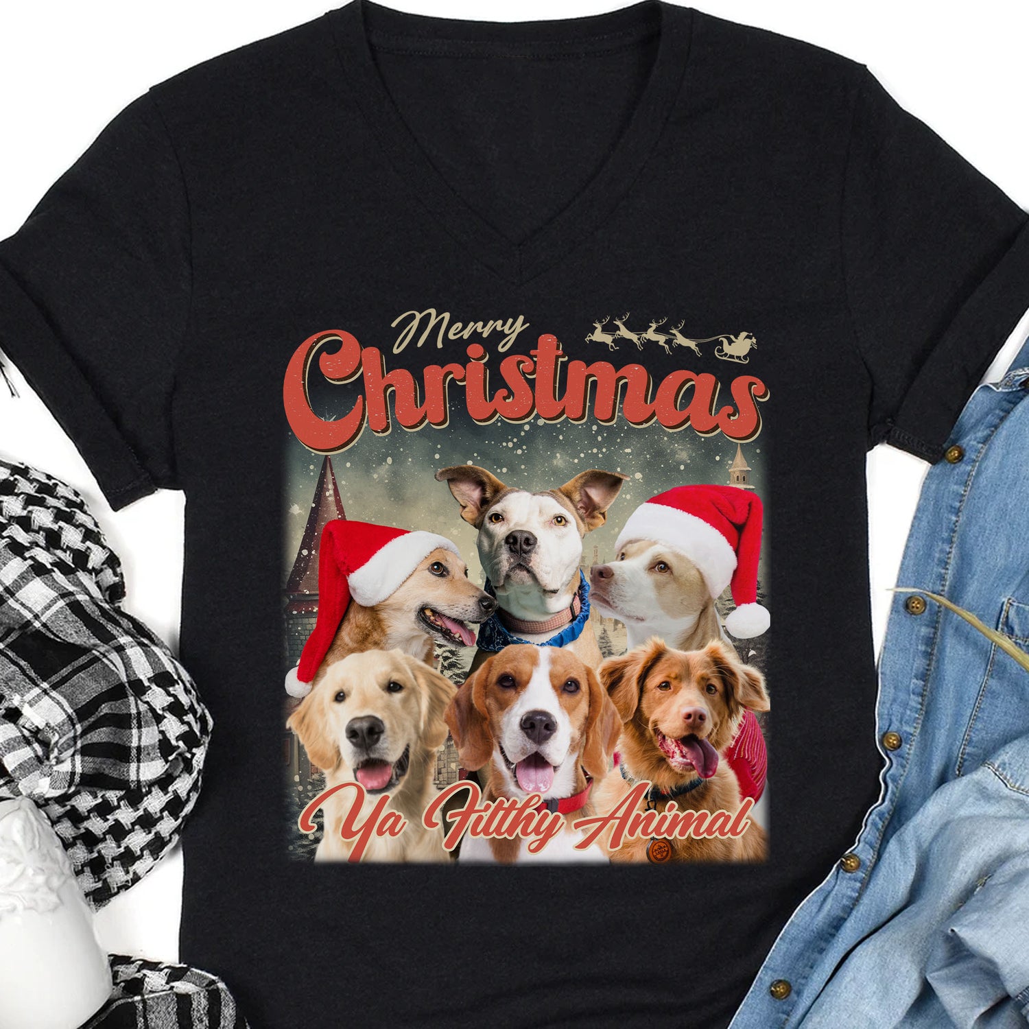 Live Preview Custom Your Pets Christmas Tee, Retro Vintage Portrait Bootleg shirt, Personalized with Your Own Dog or Cat Photo C849