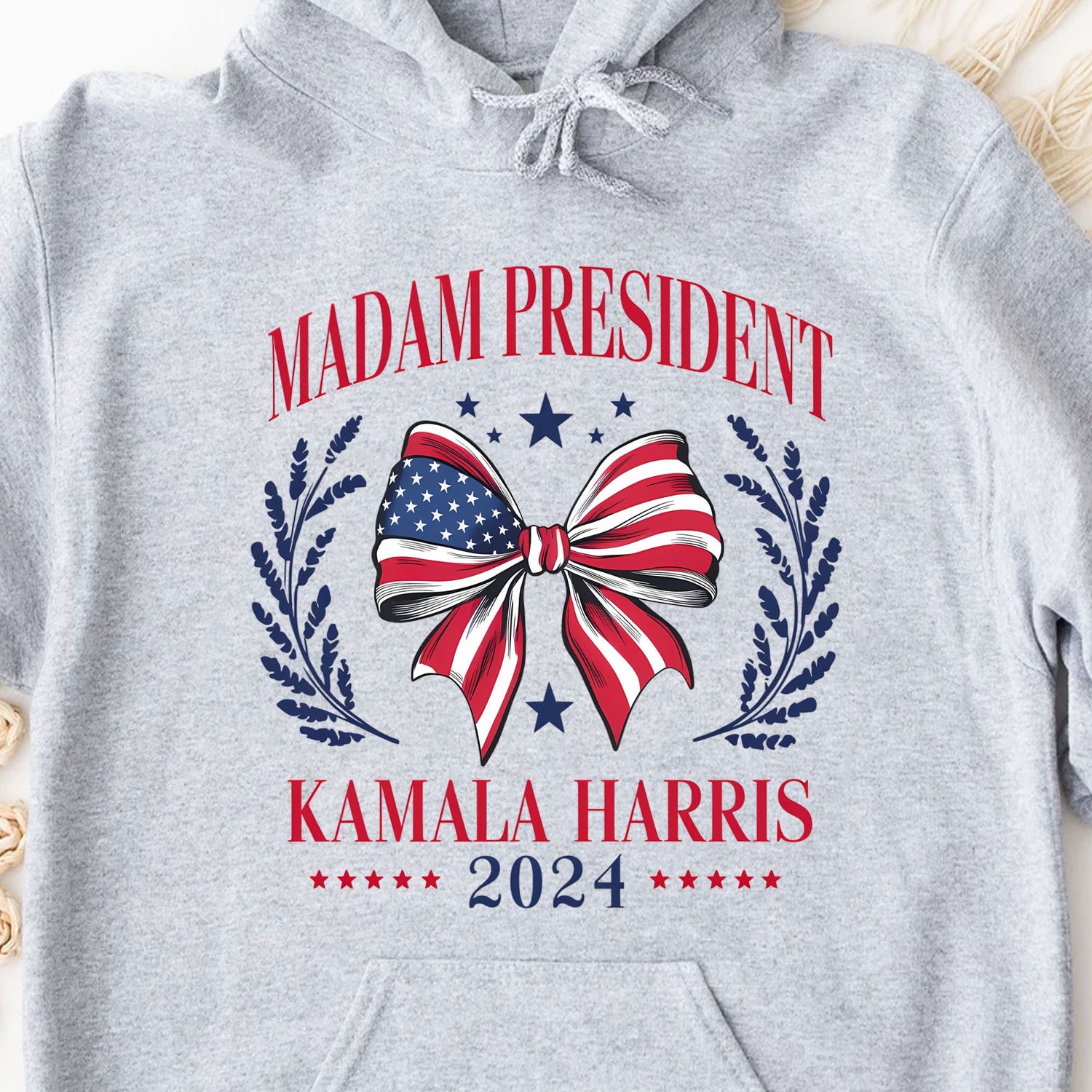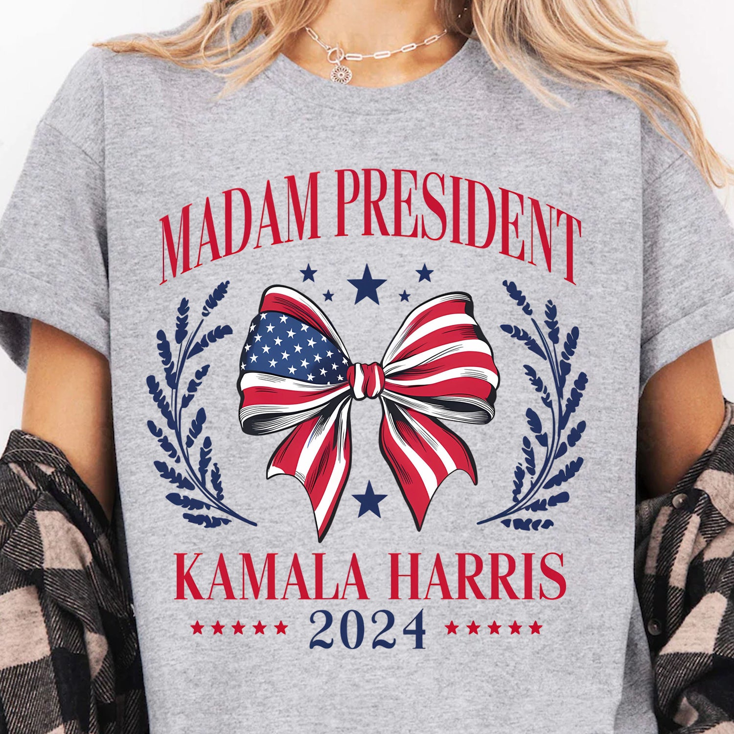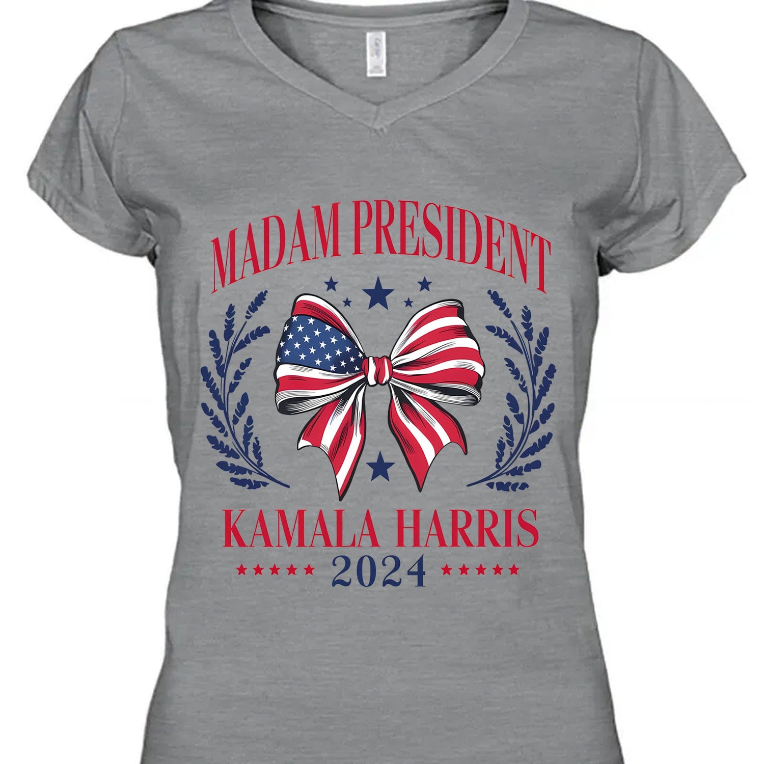 This patriotic t-shirt features a bold design promoting Kamala Harris for President in 2024. The white shirt displays "MADAM PRESIDENT" in large red letters at the top, with "KAMALA HARRIS 2024" beneath in a matching style. The centerpiece is a decorative bow in the pattern of the American flag, surrounded by blue laurel branches and stars. This eye-catching graphic combines red, white, and blue colors for a classic American look.