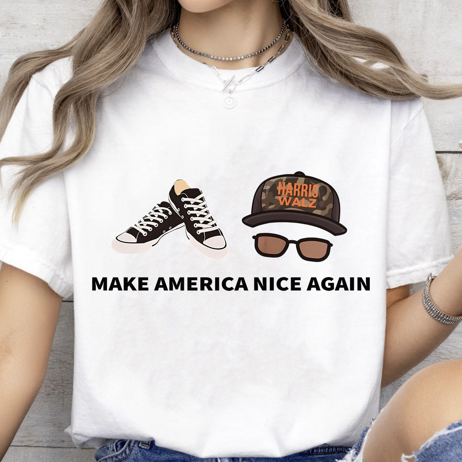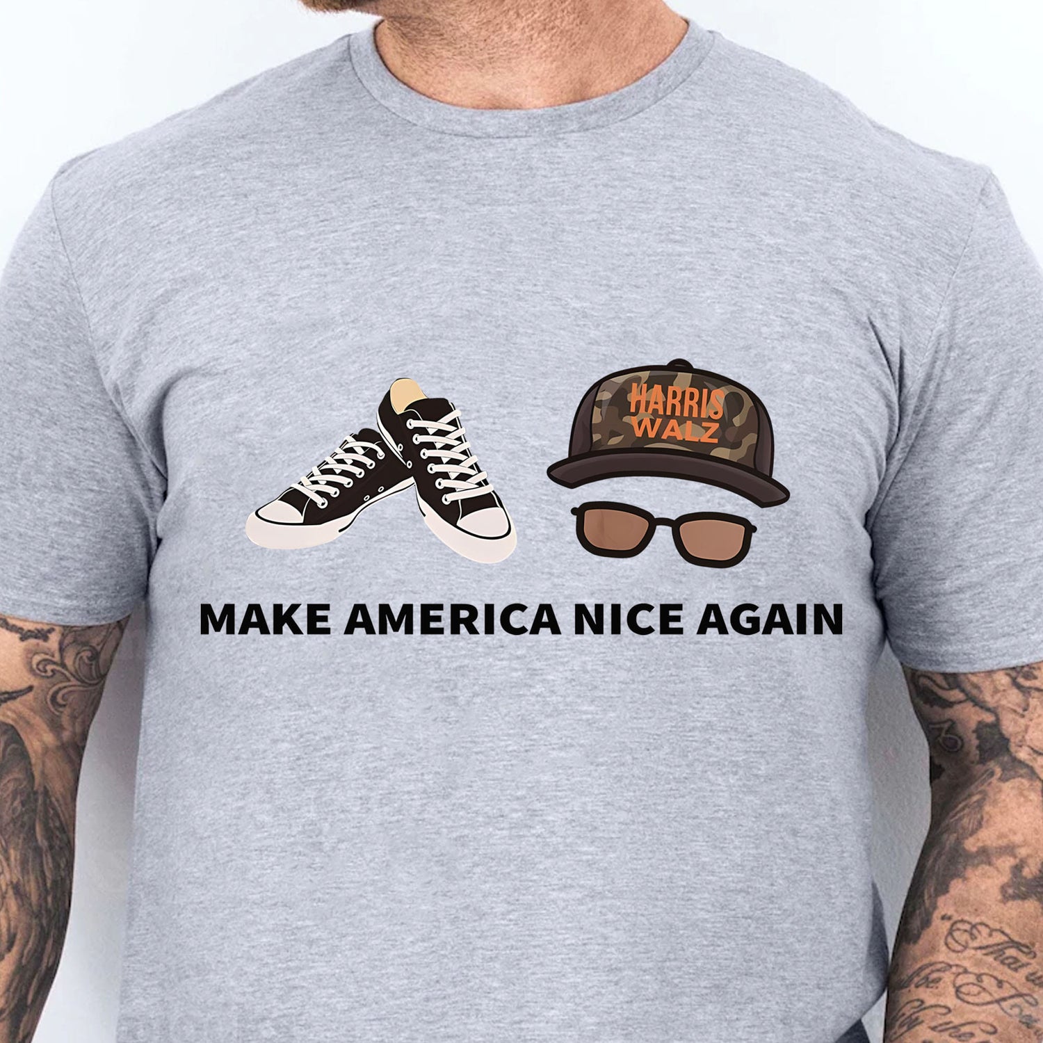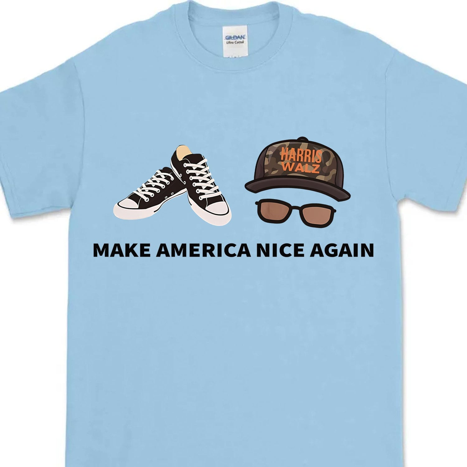 This t-shirt showcases a unique and stylish design featuring a pair of classic black-and-white sneakers alongside a camouflage cap and glasses. The cap is emblazoned with "Harris Walz," adding a touch of political flair. Below the imagery, the phrase "Make America Nice Again" is boldly printed, delivering a positive and inclusive message with a hint of humor. This shirt is perfect for those who appreciate casual fashion with a statement, blending laid-back style with a call for kindness and unity.