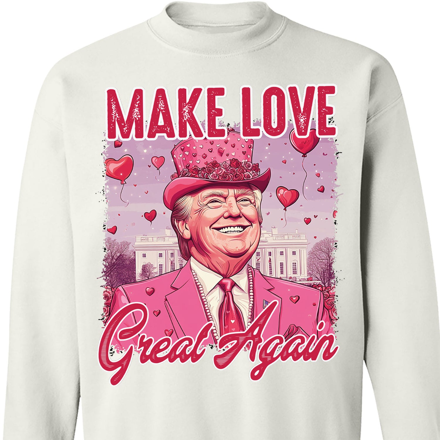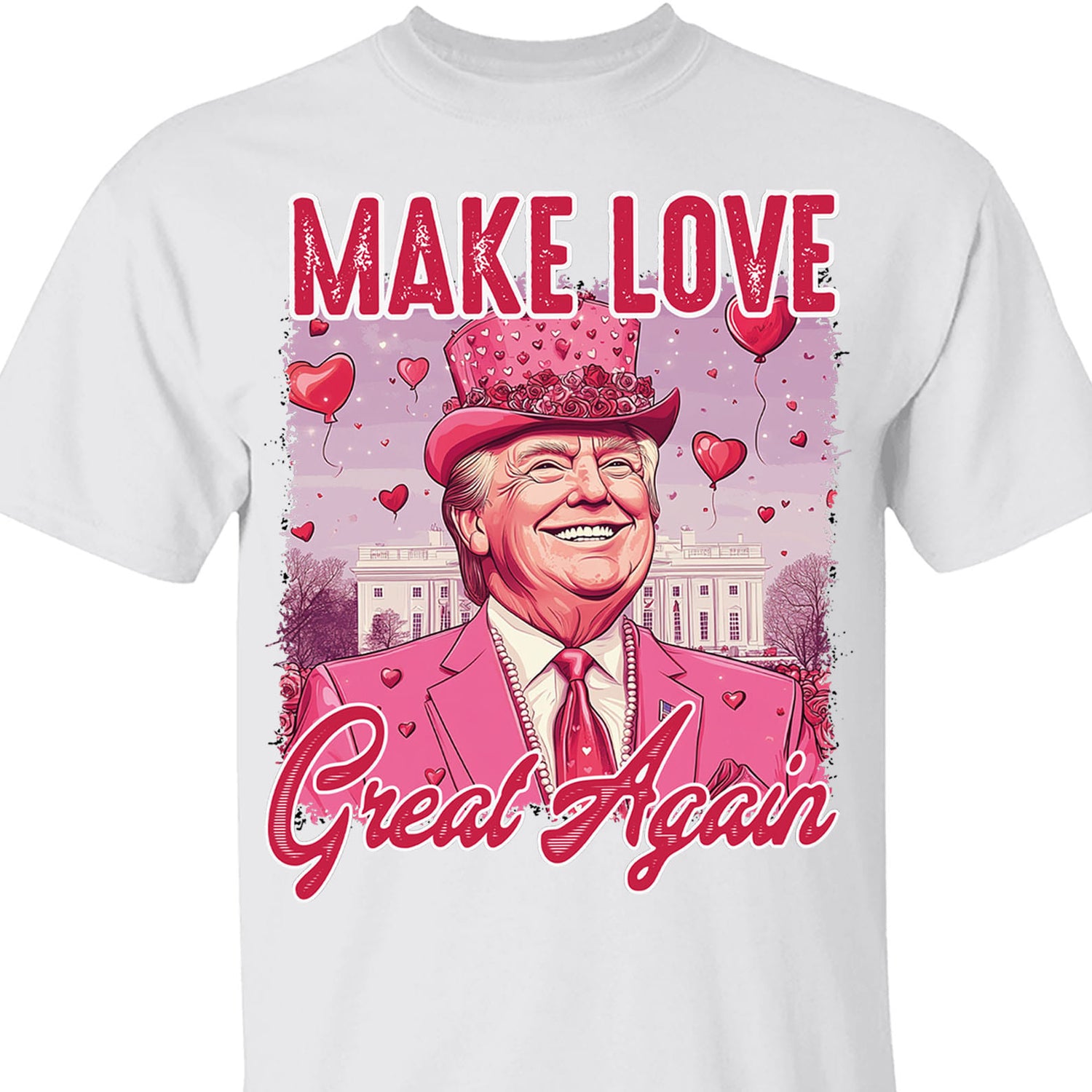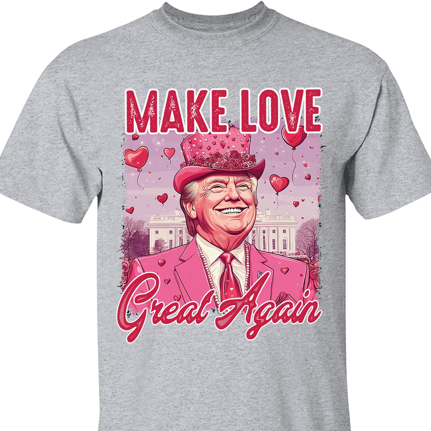 This eye-catching shirt features the fun and whimsical design "MAKE LOVE GREAT AGAIN" in bold red and pink lettering. At the center is a cheerful Trump figure dressed in a bright pink suit and heart-adorned hat, radiating joy and charm. Set against the iconic backdrop of the White House and surrounded by floating heart-shaped balloons, this design perfectly blends patriotism, humor, and a celebration of love. Made with high-quality, comfortable fabric, this shirt is ideal for Valentine’s Day, festive gatherings, or anyone who enjoys a lighthearted statement piece.