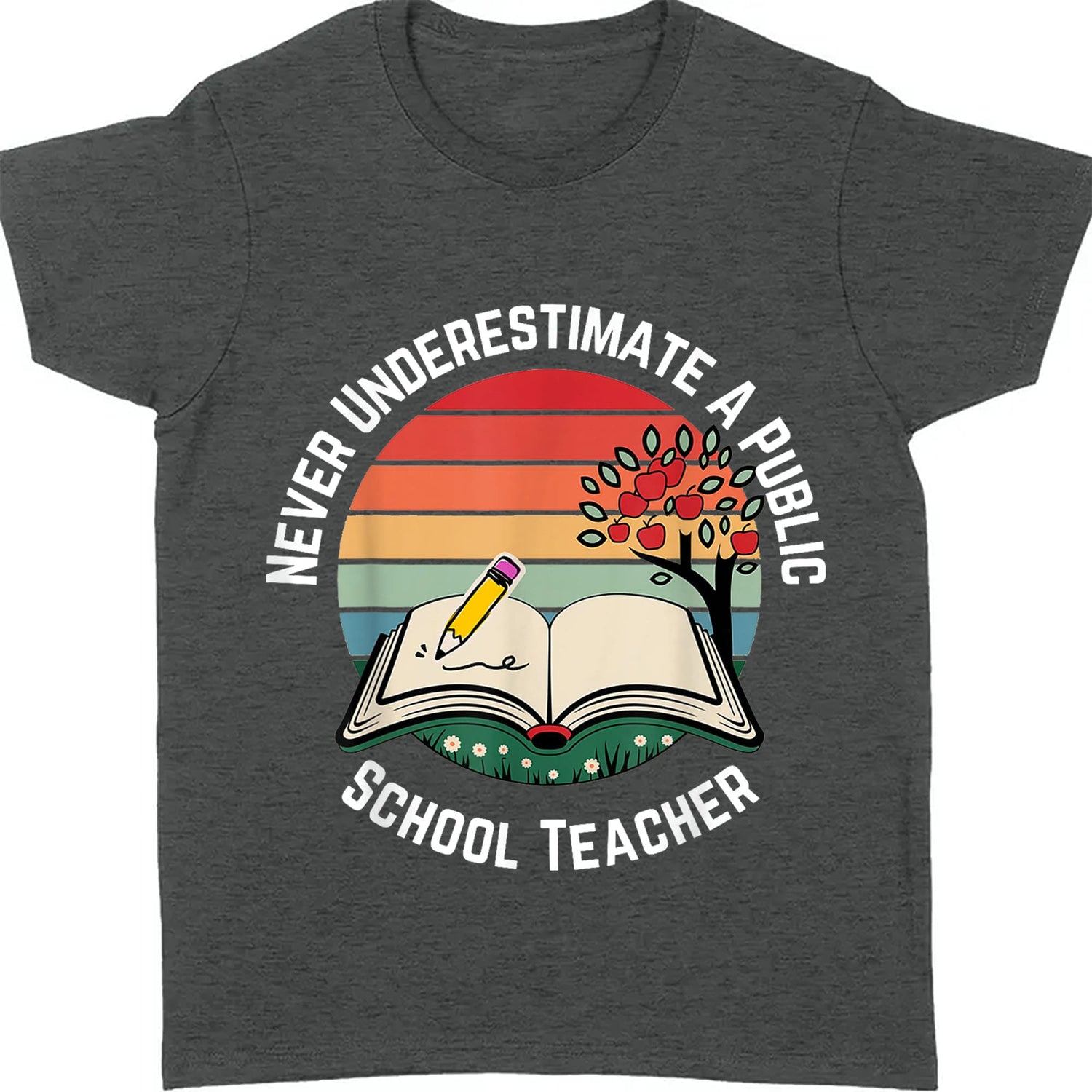 This t-shirt design features a bold and colorful tribute to public school teachers. At the center, a circular rainbow background in retro style, reminiscent of a sunset scene, creates a vibrant and nostalgic feel. In the foreground, an open book and pencil symbolize the tools of education, while an apple tree stands tall as a nod to the classic imagery of teaching. Encircling the design is the phrase "NEVER UNDERESTIMATE A PUBLIC SCHOOL TEACHER" in a strong, confident font, emphasizing the dedication and impact of educators.