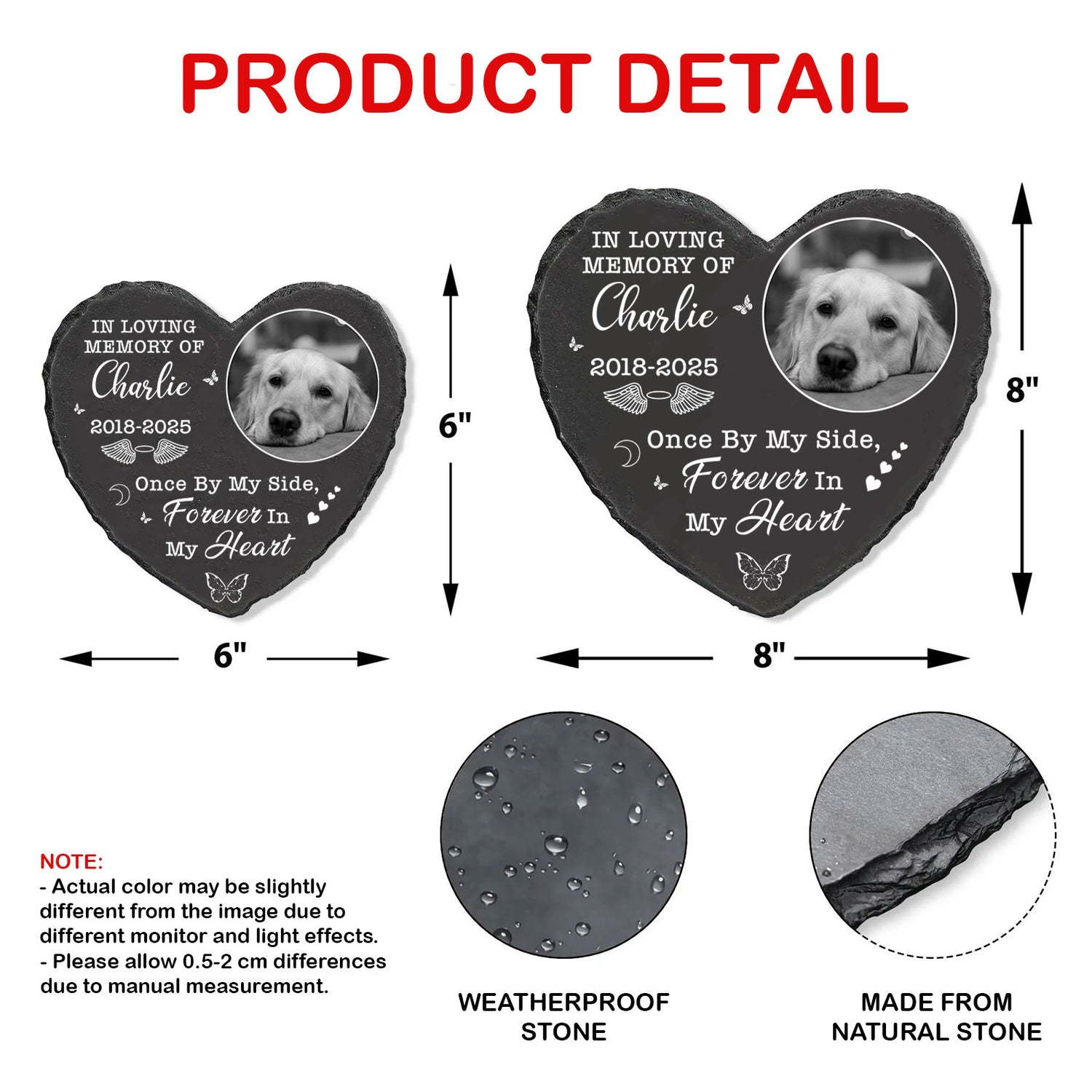 Create a personalized tribute with our customizable memorial stone, featuring the touching quote 'Once By My Side Forever In My Heart.' You can upload a cherished photo of your loved one, along with their name and years of life, making this memorial stone a unique and heartfelt tribute. Ideal for gardens, gravesites, or home displays, this stone serves as a lasting reminder of the love and memories shared. Honor their legacy in a meaningful way with our beautifully crafted memorial stones.