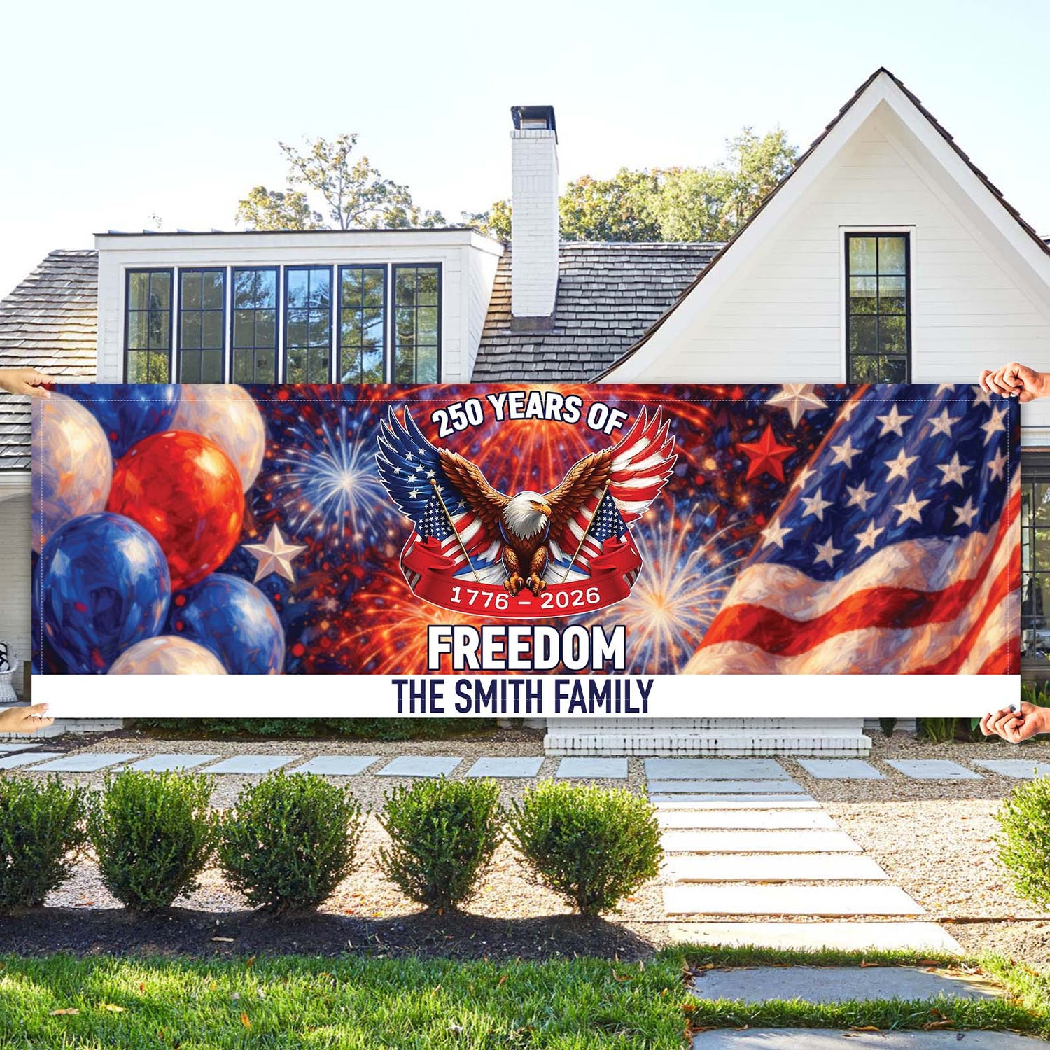 Designed to commemorate the 250th Anniversary of the United States (1776–2026), this eye-catching banner flag features a majestic bald eagle, flowing American flag, and festive fireworks in classic red, white, and blue. Customized with your family name, it’s the perfect statement piece for your home, garden, or patriotic celebrations.
