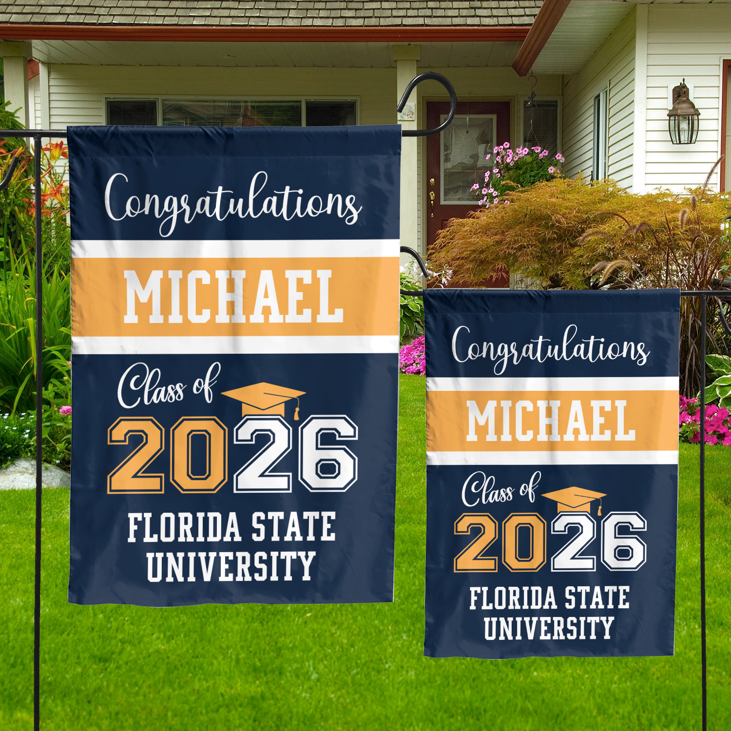A personalized graduation garden flag is a beautiful way to celebrate your academic achievement and show your pride in your school. You can customize your flag with your name, year, degree, school logo, or any other text or graphic that you want. Your flag will be printed on durable and weather-resistant fabric that will last for years.