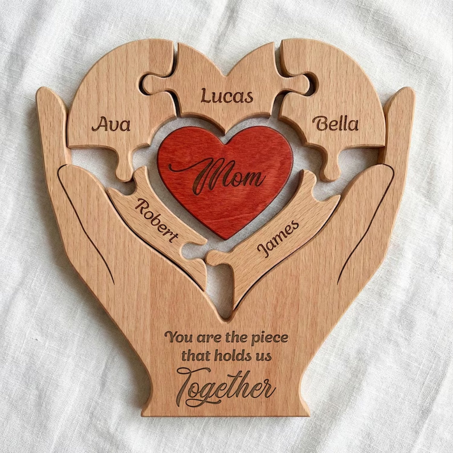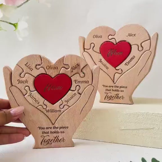 Celebrate the love that holds your family together with this personalized wooden puzzle sign, featuring custom engraved names and a heartfelt message for mom. Designed with interlocking puzzle pieces and a beautiful heart centerpiece, this meaningful keepsake symbolizes unity and love. Perfect for Mother’s Day or special occasions, it’s a thoughtful gift from kids that mom will cherish for years to come