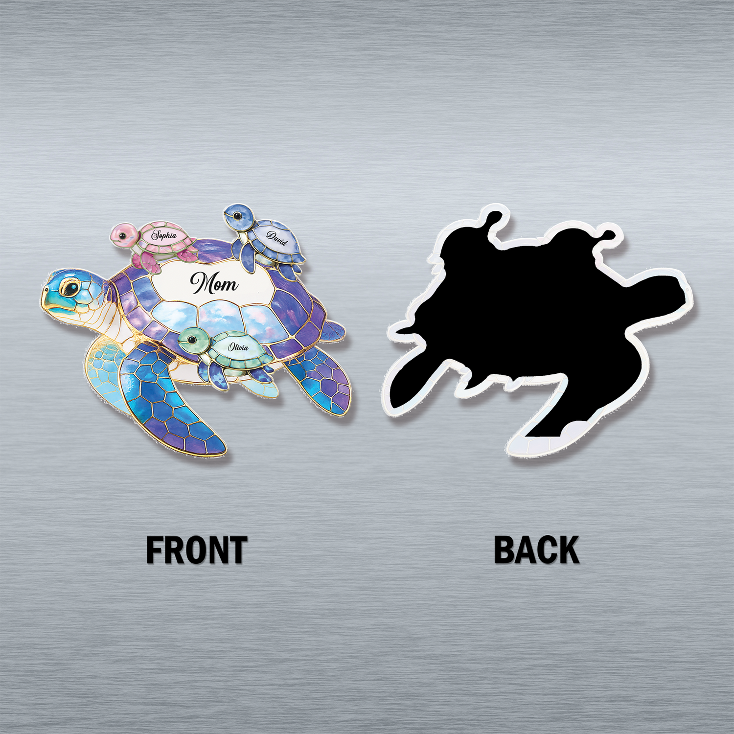 Bring a splash of ocean-inspired beauty to the heart of the home with this charming faux stained-glass fridge magnet, an ideal and thoughtful gift to give for mother's day. This beautifully designed piece features a vibrant sea turtle family swimming together in stunning shades of blue, purple, and green, complete with elegant gold-toned accents that mimic real glasswork. Making it a truly heartfelt keepsake for grandma and mom, the large central turtle can be customized with their special title, while the little baby turtles riding along the shell can be fully personalized with the individual names of their beloved children or grandchildren. Backed with a strong, full-coverage magnetic surface, this flat, die-cut decoration securely adheres to refrigerators, dishwashers, or any magnetic surface, serving as a bright, colorful, and practical daily reminder of family love.