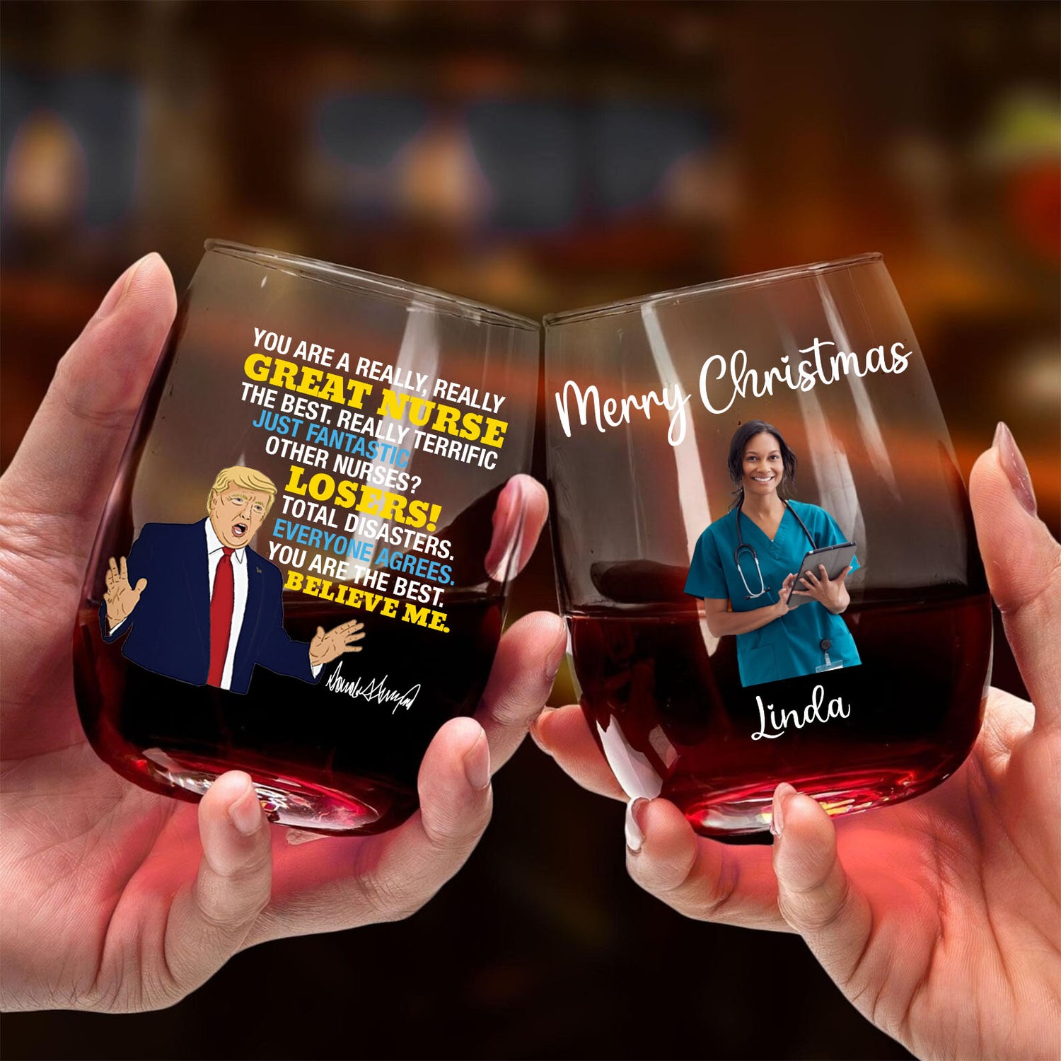 Celebrate the hardworking nurse in your life with a wine glass that’s both hilarious and heartfelt. One side features a cartoon-style image of President Trump delivering a bold, exaggerated “speech,” packed with praise like “You are a really, really GREAT NURSE… Other nurses? LOSERS! Everyone agrees. Believe me.” — a humorous twist that’s sure to bring a smile after a long shift.