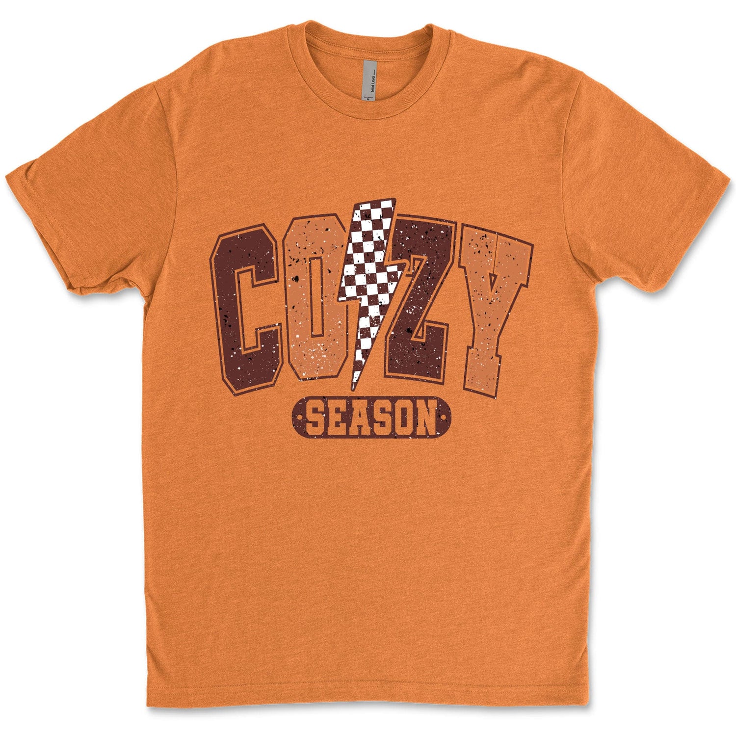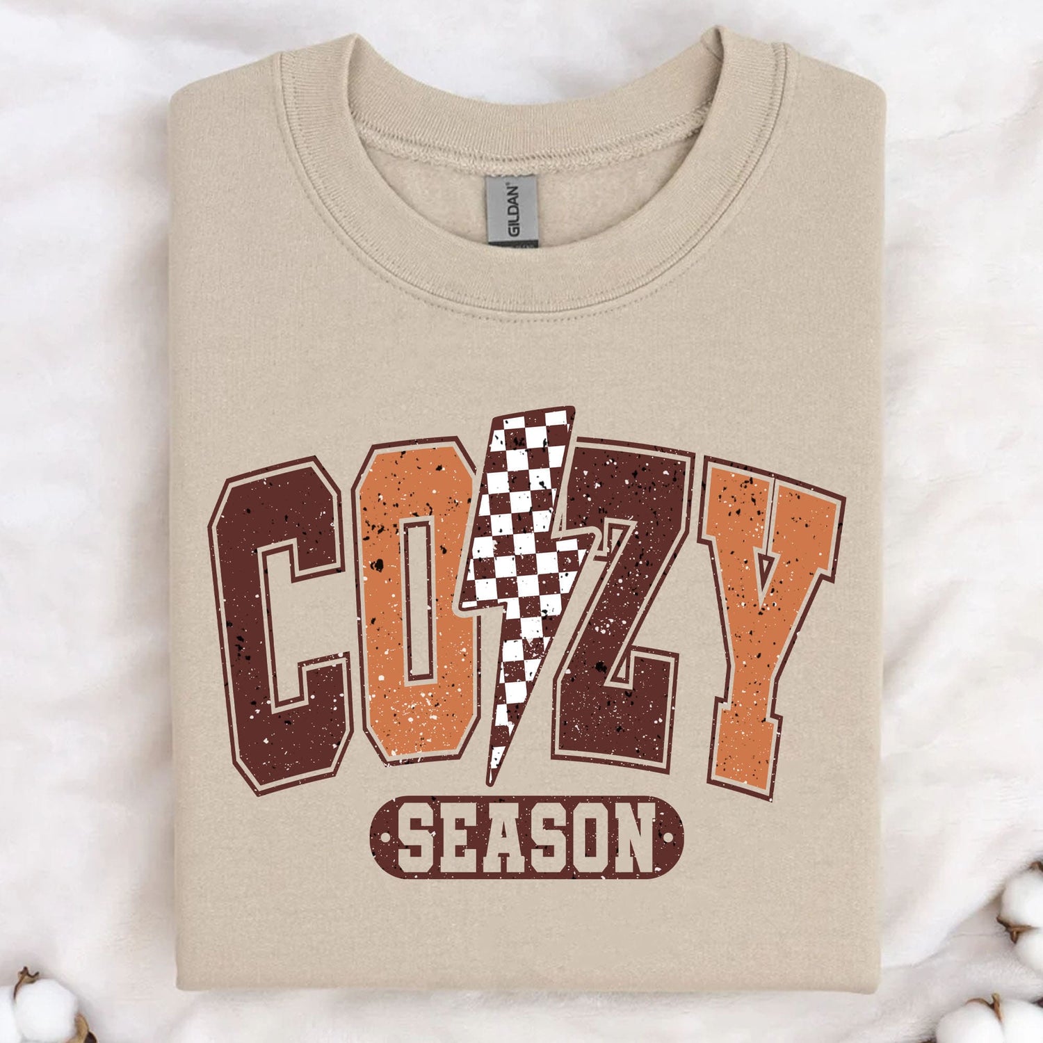This t-shirt design features the word "Cozy" in a large, eye-catching font with a delightful cookie pattern decorating the letters. Between the "Co" and "zy," a flash symbol adds a dynamic touch. Below the word "Cozy," the text "Season" is enclosed within a rounded rectangle, creating a warm and inviting design perfect for the cozy season.