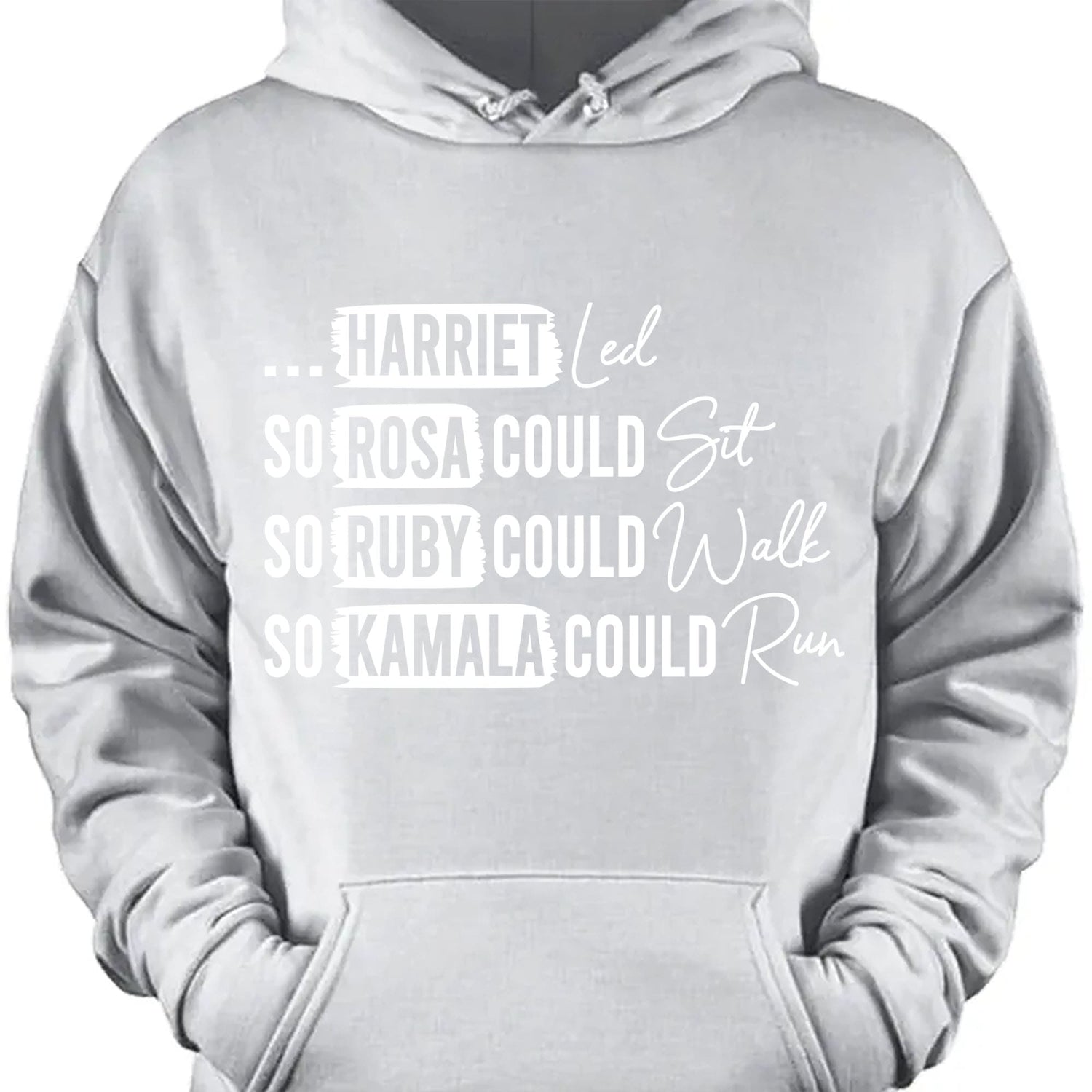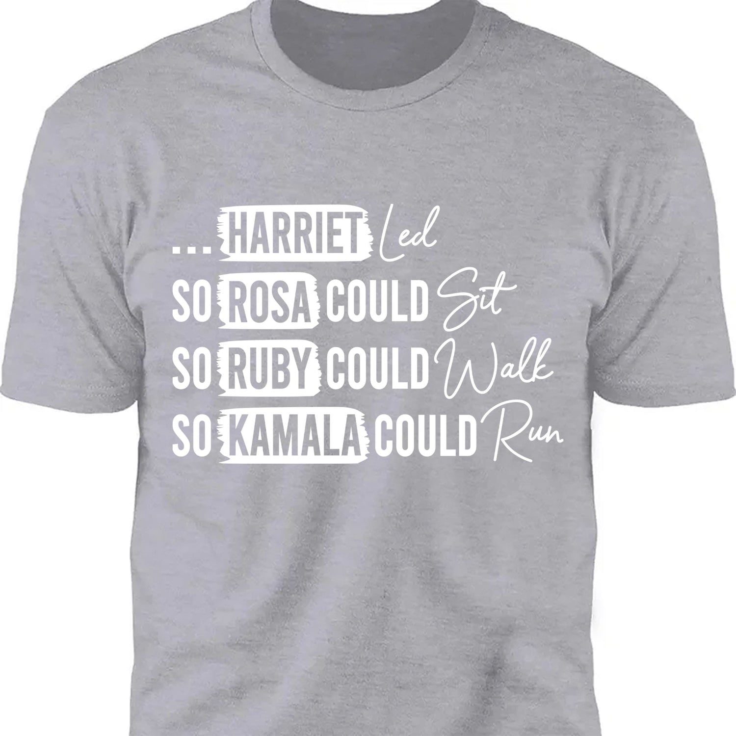 This powerful t-shirt design honors the legacy of trailblazing Black women who have paved the way for future generations. The design features the bold text:"...HARRIET Led, SO ROSA COULD Sit, SO RUBY COULD Walk, SO KAMALA COULD Run". Each statement is visually emphasized with the words "Led," "Sit," "Walk," and "Run" in a flowing script, creating a dynamic contrast with the bold, all-caps text. The layout highlights Harriet Tubman, Rosa Parks, Ruby Bridges, and Kamala Harris, symbolizing their courage and leadership throughout history.