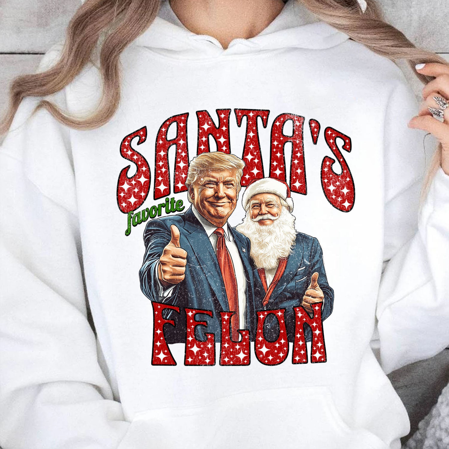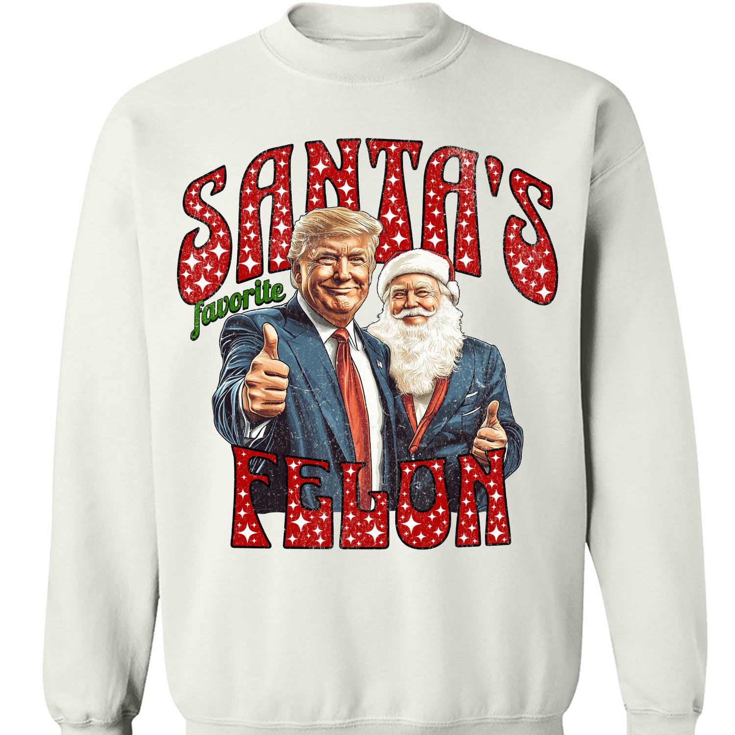 This sweatshirt design features a humorous holiday illustration of Donald Trump standing beside Santa Claus. Trump, dressed in a suit and red tie, gives a thumbs-up and smiles, while Santa, wearing his traditional red and white suit, also smiles and holds up his thumb. The text above them reads "SANTA'S favorite FELON" in bold, red letters with a festive star pattern. "Santa's" and "Felon" are prominently displayed, with "favorite" in green cursive, adding a playful touch. This design combines Christmas cheer with a satirical twist.